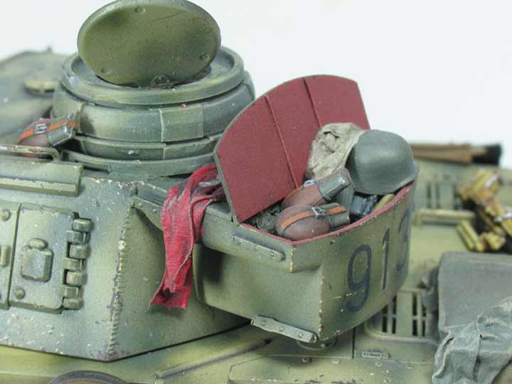Der Panzerkampfwagen IV ist ein Academy Bausatz! Diesen erstand ich sehr sehr preiswert bei Ebay. Im Grunde sollte das Fahrzeug einmal einen abgeschossenen Panzerkampfwagen darstellen, doch ich entschied mich um. So wurde, insofern es bei dem Bausatz überhaupt möglich war,einiges mit Plastikkarte nachgebildet, und anderes aus der Ersatzteikiste entnommen. Da es sich nun nicht um ein abgeschossenes Fahrzeug handeln sollte, fügte ich dem Panzerkampfwagen reichlich Schäden zu. Bemalt und gebrusht ist das Fahrzeug mit Tamiya und Humbrol, Revell, und wasserlöslichen Farben.