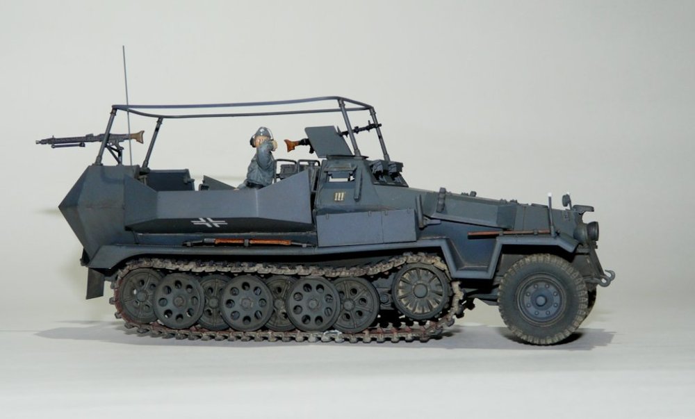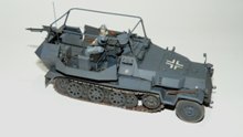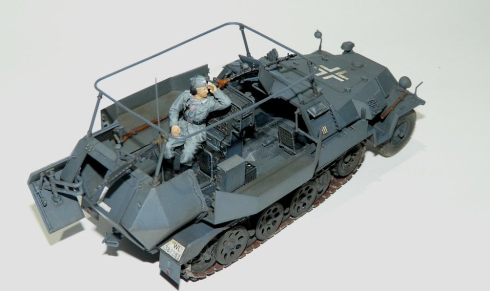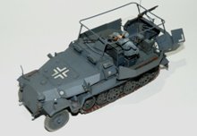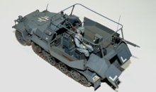 Erbauer: Christian Meyerhoff Moin! Hier ein paar Bilder meines Sd. Kfz. 251/17 in der Version als Funkwagen. Der Bausatz von AFV ist sehr gut detailliert, aber schwerer zu bauen als vergleichbare Bausätze anderer Hersteller. Dem Bausatz liegen Vinylketten bei, die aber zu kurz sind. Hier kamen dann Einzelkettenglieder von Dragon zum Einsatz. Im Innenraum wurden eine Telexmaschine mit Batterie und noch ein zusätzliches Funkgerät aus dem Sortiment von Verlinden verbaut. Der Funker stammt von Dragon und wurde mit Decals von Passion-Models verfeinert. Die Lackierung erfolgte mit Humbrol und Revellfarben. Bei der Alterung habe ich mich etwas zurückgehalten, lediglich das Laufwerk und die Ketten wurden mit Pigmenten behandelt. Der Rest des Fahrzeugs wurde nur mit verdünnter Ölfarbe behandelt. Wer sich für den Bau des Modells interessiert kann hier nachschauen: Sd.Kfz. 251/17 Ausf.C Command Vehicle AFV Club Viel Spaß mit den Bildern.