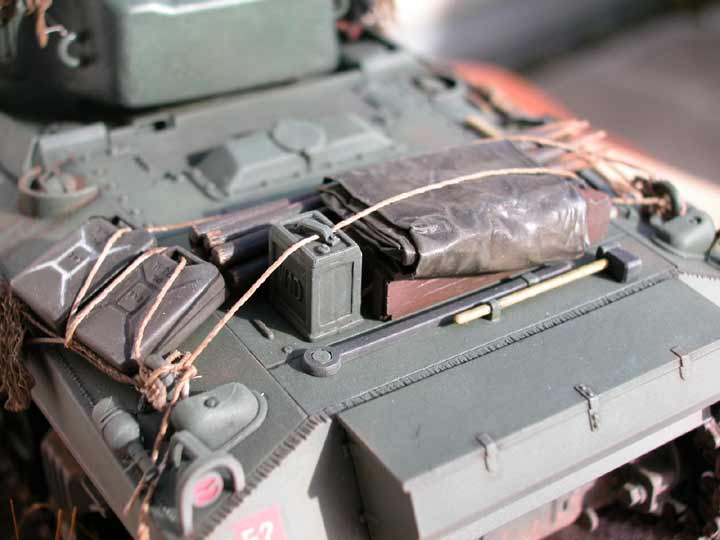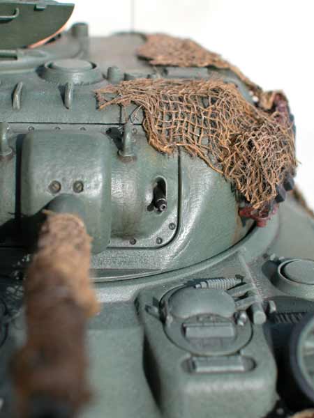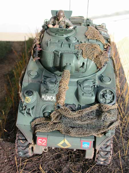 Hier sehen wir den M4A4 von Dragon, gebaut von Ulrich Pfaff. M4A4-Bausatz mit den t48-Ketten und Laufrollenstützen mit horizontalem Arm vom M4A1-Bausatz. Die Figur ist von Warriors British Tank Crew mit Ultracast-Kopf. Markierungen zeigen das Fahrzeug des Commanding Officer (Lt. Col. Gooch) des 1st Armoured Battallion Coldstream Guards, Guards Armoured Division, mit dem Namen Monck. Ich habe mich bei dem Modell an einer Farbzeichung aus einem Osprey-Buch orientiert, allerdings war das Original laut Vorlage eine Direct-Vision-Version (hatte aber keine Lust, mir für teuer Geld so eine Oberwanne zu besorgen, falls es überhaupt eine gibt.) Modell wurde bis auf Kleinigkeiten (Staumaterial, Antennen, Abschleppschäkel) aus der Box gebaut. Die Bodenplatte ist wie immer eingeweichter Eierkarton als Basis, darüber mit Fliesenfugenmörtel und feinen Steinchen Erdboden simuliert, diverse Farbaufträge mit Airbrush und Wasserfarbe (!). Das plattgewalzte Kornfeld besteht aus Borsten eines groben Pinsels, das Gras an dem kleinen Graben ist Statikgras. Die Szene zeigt Monck beim Angriff der Coldstream Guards auf die Ortschaft Cagny während Operation Goodwood am 18. Juli 1944.
