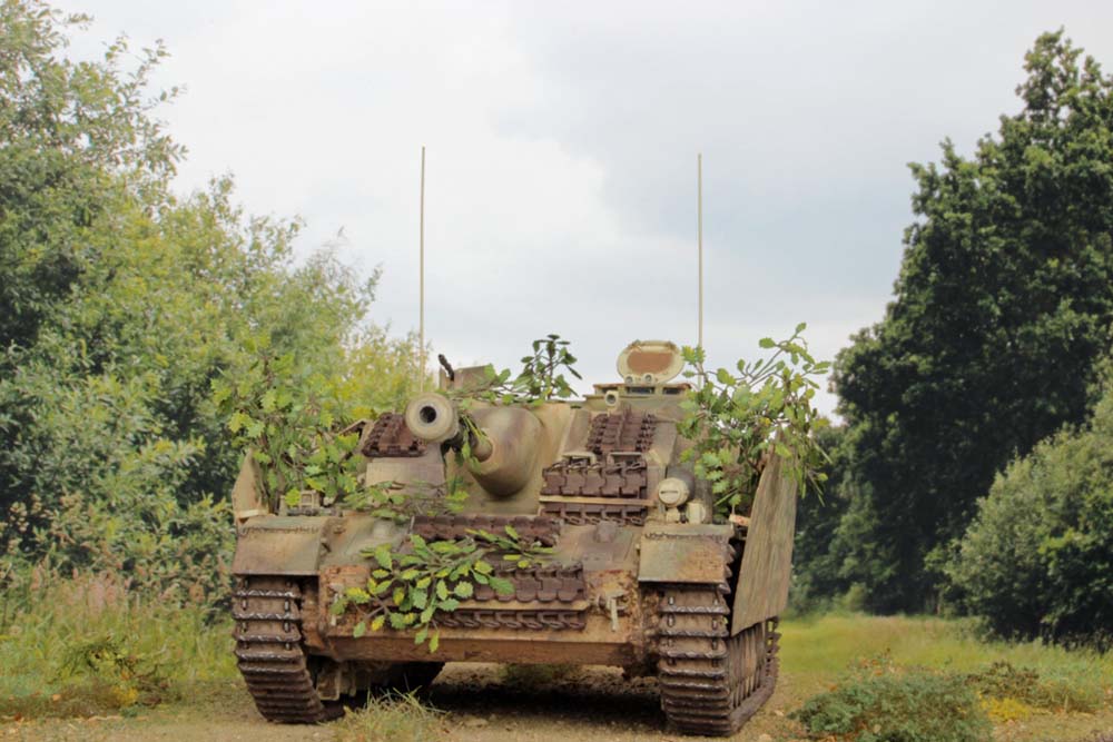 Mein Sturmgeschuetz IV habe ich anhand von Fotos so gebaut und bemalt, wie sie im Spaetsommer und Herbst 1944 im Einsatz war. Da zu diesem Zeitpunkt keine Luftueberlegenheit mehr vorhanden war, wurden alle Fahrzeuge zusaetzlich mit Zweigen getarnt. Ab August/September 1944 wurden alle Panzer bereits im Herstellerwerk getarnt. Dabei gab es genaue Vorschriften wie die Fahrzeuge zu bemalen waren. Bei der Bemalung habe ich den damals ueblichen Drei-Farben Tarnanstrich angewendet, bei dem unregelmaeßige gruene und braune Tarnflecken (RAL 6003 und RAL 8017) auf die dunkelgelbe Basisfarbe gesprueht wurden. Die Farben habe ich anhand von Farbtafeln aus Tamiya Acryl Farben gemixt. Die Tarnmuster der Schuerzen wurden im Spaetsommer 1944 an nahezu allen deutschen Panzern mit Schablonen in einem Scheibenmuster aufgesprueht. Auch fuer die Feinbemalung der Ausruestungsgegenstaende habe ich die Tamiya Acrylfarben verwendet. Mit dunklen Oelfarben erfolgte dann das Washing des gesamten Fahrzeuges. Anschließend wurde mit verschiedenen Oelfarben trockengebuerstet und leichte Verschleißspuren aufgemalt. Die Detailbemalung und das Finish erfolgte auch mit Oelfarben. Zum Abschluss wurden Schmutz und Staub mit MIG Pigmenten erzeugt.