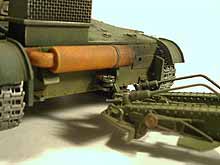 Uralt-Bausatz von Mirage. Gleich zum Anfang. Finger weg davon! Jedenfalls all die, welche Nacharbeit, Spachteln und Fluchen ablehnen. Von den Vorgenannten Dingen muss man bei diesem Bausatz `ne Menge auf Vorrat haben. Doch Halt! Der Reihe (Bauanleitung) nach. Für Grobinformationen noch verwendbar, für Detailfragen kann man darauf verzichten. Sei es die Montage der Achsen für die Leiträder oder die Anbringung der Werkzeuge. Die Detaillierung des ganzen Modells lässt sehr zu wünschen übrig. Zumindest waren ein ganz Teil Nieten notwendig um das ganze etwas weniger grob aussehen zu lassen. Positiv das Fahrwerk was relativ filigran und dazu noch beweglich ist. Viel Spaß beim Zusammenbau von jeweils 2 Fahrwerkshälften mit 4 Radpaaren. Am besten gleich auf dem Fußboden Platz nehmen, dann können die Teile nicht soweit davonspringen. Ja was noch? Ach natürlich Farbgebung und die Ketten. Ersteres mit Airbrush und Tamiya-Farben. Letzteres mit viel Geduld und am Ende einen AHA-Effekt. Die dem Bausatz beiliegende Einzelgliederkette besteht aus 196 Teilen. Einfach vom Spritzling trennen und zusammenkleben geht natürlich auch. Ich habe mich der Mühe unterzogen und Teil für Teil zu Endgraten und das Ganze dann zur Kette zu komplettieren. Ob das Endgraten notwendig war? Keine Ahnung! Aber ich kann ruhiger Schlafen, wenn ich weis der Grat ist ab. Es darf gelacht werden.