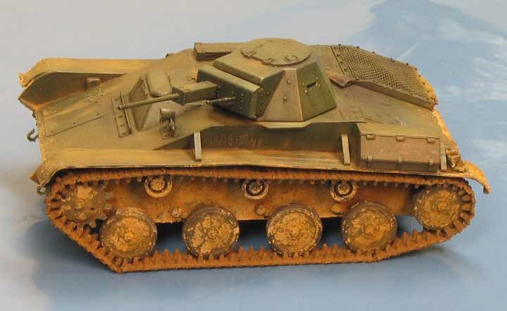 Dieser T-60 war das erste Modell von Zvezda, was ich leider erst nach dem Kauf erfahren habe. Die Ernüchterung kam schon gleich nach dem Öffnen der Schachtel. Ein Bausatz wie vom Jahrmarkt: Grober, dunkelgrün glänzender Plastikguß, die Wanne unten und an den Seiten eine nahezu detailfreie Zone, Anbauteile und Räder grob vereinfacht. Aber die Kette toppt alles: zwei silbrig glänzende Vinylstücke, die nicht mal entfernt Ähnlichkeit mit einer Panzerkette haben und die als i-Tüpfelchen auch noch 1cm zu kurz sind. Die Passgenauigkeit der Teile war auch eher schlecht. Eigentlich ist der Bausatz so ein Fall für die Mülltonne. Aber ich konnte aus den überzähligen Teilen eines Bausatzes von RPM vieles ersetzen. Dazu kamen noch scratch gebaute Teile aus Plastikprofilen, Draht und Gitter sowie Ätzteile. Von Zvezda blieb nur noch die Wanne, die Rücklaufräder und der Turm (ohne Walzenblende und Kanone) übrig. Einige Teile wurden von mir noch etwas nachgebessert. MG, Kanone, Auspuff aufgebohrt, Schraubenköpfe und elektrische Leitungen ergänzt, Werkzeugkiste verfeinert, Kettenbleche dünner geschliffen usw.