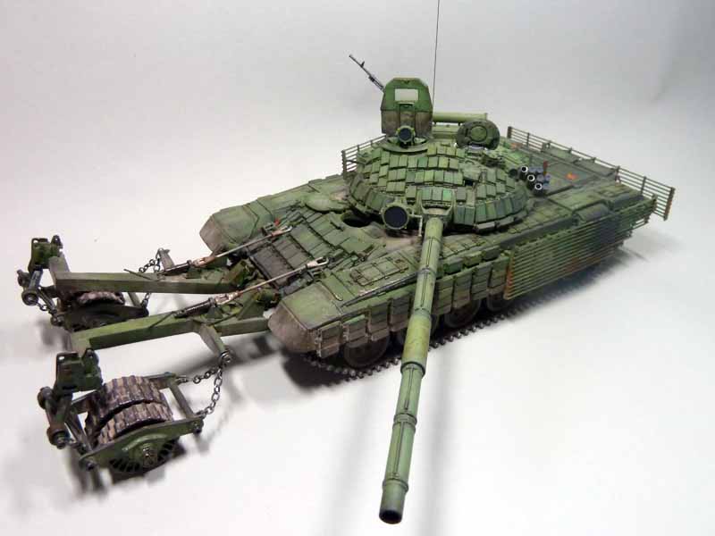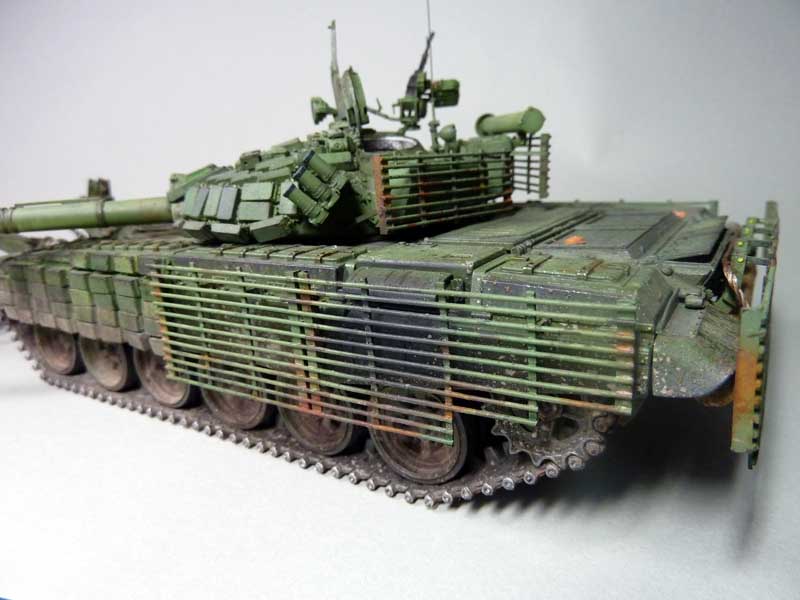 Erbauer: Jacek Golla Das Modell stellt einen russischen T-72B mit Reaktivpanzerung, SLAT-Armour und KMT Minenräumpflug dar. Als Basismodell diente der T-72 von Tamiya, diverse Resin-Umbausätze von Miniarm und der Minenräumpflug von MIG Productions kamen ebenfalls zum Einsatz. Die SLAT-Armour wurde nach Originalbildern komplett aus Plastik-Profilen von Evergreen nachgebaut. Die Figuren stammen aus dem Hause TANK. Lackiert wurde das Modell mit Acrylfarben von Vallejo, die Alterung und Verschmutzung entstand aufwendig durch Anwendung verschiedener Methoden. Unter anderem kamen die Haarspray- und Schwammmethode für Lackschäden und mehrere Pigmente für die Darstellung von Staub zum Einsatz. Die Bauzeit betrug insgesamt etwa 11 Monate. Hierbei hat die SLAT-Armour einen sehr großen Teil der Zeit in Anspruch genommen.