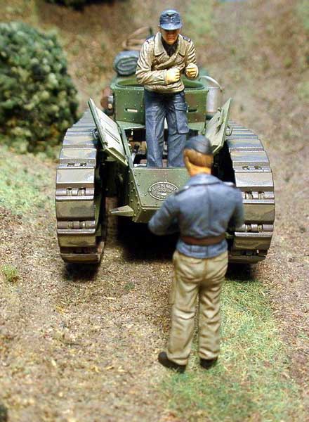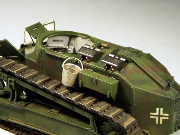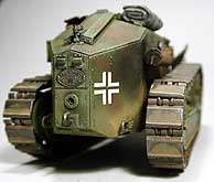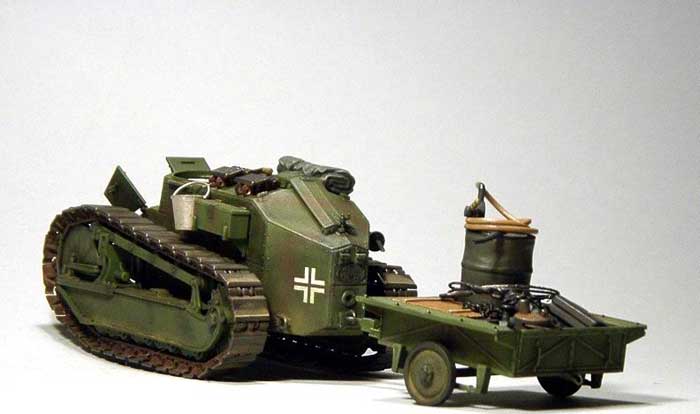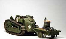 Das Modell wurde gebaut von Thomas Hofmann Eher unscheinbar und auch schon einige Zeit auf dem Markt kommt von der Firma RPM, unter der Nummer 35064, das Modell des TRAKTOR 730(f). Eigentlich der französische Panzer FT-17 aus der Zeit nach dem WW I der, in einigen Varianten, ebenfalls von RPM hergestellt wird. Mein Bausatz ist das turmlose Fahrgestell des FT-17, im Einsatz als Schlepper bei der EDW, inklusive des kleinen Trailers der schon vom Renault UE Schlepper her bekannt ist. In diesem Fall aber nicht mit Kettenlaufwerk sondern mit Hartgummirädern, obwohl dem Bausatz auch die Bauteile für diese Variante beiliegen. Da man durch den abgenommenen Turm und die großen Bugklappen einen extrem guten Einblick in den Innenraum hat verlangt das Modell nach etwas Detaillierung und Aufrüstung. Zwar liegen einige rudimentäre Teile für den Innenraum bei aber das reicht nur wenn die Bugklappen geschlossen bleiben und auch der Turmausschnitt abgedeckt wird. Hier bietet sich der von der Firma ARMO unter der Nummer 35529 produzierte, aus Resin- sowie PE-Teilen bestehende Interior-Bausatz für den FT-17"Cañon", an. Die dem Grundbausatz beiliegende kleine PE-Platine greift nur Außendetails ab. Hier gleich noch etwas Grundsätzliches. Mein gespaltenes Verhältnis zu PE-Teilen wurde auch hier wieder auf eine harte Probe gestellt. Ob das am Bausatz oder an mir liegt sei dahingestellt. Ganz sicher aber lag das an der GROTTENSCHLECHTEN Kopie der Bauanleitung welche dem Ergänzungskit beilag. Beweise für meine Behauptung will ich gerne antreten. Meine Meinung, wenn ich zusätzliche Bauteile für ein Modell herstelle und mir das bezahlen lasse, so sollte ich dafür sorgen das der Käufer mit dem Produkt auch etwas anfangen kann. Jetzt soll mir Keiner mit Quellstudium kommen! Ich will vor allen Dingen bauen und nicht forschen. Schließlich nenne ich mich Modellbauer und nicht Modellforscher. Satzende! Trotzdem habe ich versucht die Teile, welche ich als unerläßlich für eine optische Aufbesserung des Modells als notwendig erachtete, zu verarbeiten. Weggefallen sind erstmal alle Teile die den Turm des Ft-17 betrafen und vom Rest habe ich nur die Teile für den Innenraum verbaut welche ich einigermaßen platzieren konnte. Einziger Lichtblick die Resinteile. Gut gemacht und problemlos zu verarbeiten. Als dritte Komponente habe ich mir dann noch eine Einzelgliederkette aus Plast-Spritzguß, von RPM mit der Nummer 35900, geleistet. Hier liegt die Betonung auf EINZEL! Nach Adam Ries sollen hier 256 Einzelteile zu eine BEWEGLICHEN Kette zusammengefügt werden. Und.....................ihr werdet es nicht für möglich halten, es funktioniert! Aber Eines steht fest, OHNE FLEIß KEIN PREIS. Doch nun genug der Vorrede.(Mensch, das Entree war noch nie so lang.) Wie gesagt, der Grundbausatz umfasst 5 Spritzlinge mit allen notwendigen Bauteilen und ein paar für die obligate KRABBELKISTE. Eine kleine PE-Platine und eine bretterharte Vinylkette(ist das überhaupt Vinyl?) Der beiliegende Decalbogen war, da er ein FLIEGERSICHTTUCH beinhaltete, im Zickzack zerschnitten. Das betraf zwar nur das erwähnte Flieger...... usw. aber es erinnerte mich wieder, unangenehm, an Vormundschaft und Gängelei durch staatliche Behörden. Wie war das doch gleich mit den mündigen Bürgern? Weiter. Schnitt hin oder her, die Decals lassen sich ALLE verwenden. Natürlich nur wer mag! Beginnend mit den Fahrwerkskomponenten nimmt der Bau des Schleppers Gestalt an. Auch hier wieder Einzelteile ohne Ende. Man sollte sich aber auch bei den kleinsten Teilen die Mühe machen die Angußstellen, eigentlich müsste es ja Anspritzstellen heißen, nicht nur oberflächlich zu versäubern. Gerade bei kleinen Bauteilen machen sich Unkorrektheiten in der Bearbeitung optisch unangenehm bemerkbar. Hier sei nochmals an die Maßstäbe für eine gute Internet-Präsentation erinnert(Tipps & Tricks). Bodenplatte, Seitenteile, sowie Front- und Heckteil lassen sich ohne Prob zusammenkleben. Vorher sollte man natürlich alle Innendetails angebracht und farbig behandelt haben. Dann kann man das komplett montierte Resinteil, für den Innenraum, positionieren. Oberes Wannenteil aufkleben. Bis hierher, würde eine bekannte TV-Figur sagen, No Problem! Probleme in dem Sinne macht die Anpassung der Teile 55,56,57,58 zwar nicht, aber es bedarf doch einiger Feinarbeit mit Schleifpapier um die Teile einigermaßen korrekt zu platzieren. Auch die Bugklappen(Original und keine PE-Teile) sowie die Fahrer-Sichtplatte lassen sich relativ einfach positionieren. Nicht zu erwähnen brauche ich wohl das die ganze Teile schon farbig behandelt wurden. Wer es härter mag der montiert natürlich sein Modell komplett und macht dann erst die Farbgebung. Wer´s mag............... Bliebe dann nur noch die inzwischen erfolgte Montage der beiden Fahrwerkshälften. Das Fahrwerk selbst lässt sich ohne Probleme montieren. Zwar ist auch hier immer wieder Trockenanpassen nötig, aber das ist nur ein Zeitproblem. Wobei der ganze Bausatz nichts für Eilige ist. Probleme gab es noch mal mit der Anpassung der Fahrwerkskomponenten an die Wanne. Aber da ist schon nicht mehr interessant warum passt das nicht, sondern, wie kriege ich die Teile einigermaßen korrekt befestigt. Etwas probieren und das Modell stand auf eigenen Füßen...........äääh, Tschuldigung, soll natürlich heißen auf eigenen Ketten. Soviel zum Bau des Schleppers. Wen wundert es das der Bau des Trailers überhaupt keine Probs machte. Kurz noch zur Farbgebung. Habe mich da versucht an die Bauanleitung zu halten. Einschließlich etwas Washing und Drybrush. Verwendet habe ich Tamiya XF-58 als Grund und XF-64 für die Streifen. Die Ketten komplett mit XF-64 und dann die Laufflächen mit XF-1. Anschließend abreiben der Laufflächen mit Graphit und ein Auftrag von ARTITEC Farbpigmenten für Verschmutzung.Das Modell bekam ein Washing mit Ölfarbe. Drybrush mit gleichem Medium. Das war es auch schon. Fotos anschauen und das Modell selb