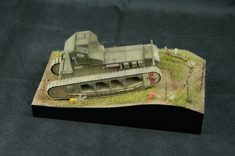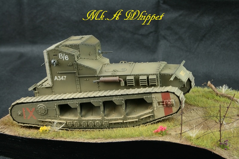 Lackiert wurde der Whippet mit Tamiya XF62 Olive Darb und aufgehellten Olive Drab. Nach dem Aufbringen der Decals wurde mit verschieden Wash`s und Ölfarben gealtert und mit Pigmenten eingestaubt. Zum Schluss kam noch eine Schicht Alclad II Flat Clear darüber.