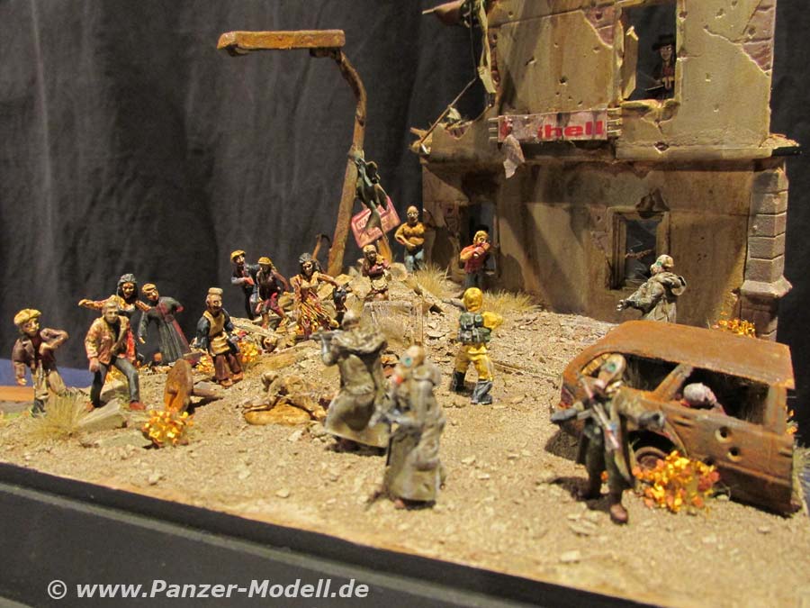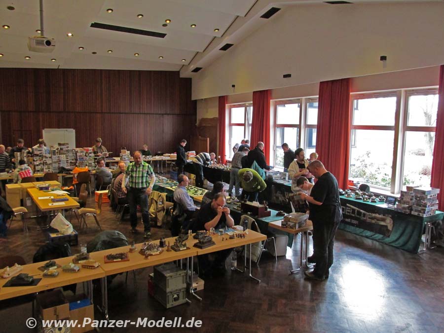 Am Samstag den 01.03.2014 fand im Soldatenheim im niedersächsischen Munster die IMM Modellbauausstellung mit Wettbewerb und anschließender Jahreshauptversammlung statt. Wir folgten der Einladung zur Teilnahme an der Ausstellung gerne und trafen am Samstag so gegen 09.00 Uhr ein. Der Ausstellungssaal war bereits durch einige Mitglieder der IMM am Vortag vorbereitet worden und so fanden wir bereits aufgestellte Tische, Stühle und dringend benötigte Stromanschlüsse vor. Unser Tisch war sogar namentlich gekennzeichnet. Wir brauchten nur reingehen, unseren Platz suchen, auspacken und aufbauen… Das nenne ich eine perfekte Organisation. Unser Lob und natürlich auch unser Dank an die fleißigen Modellbaukollegen für die tolle Vorbereitung. Wir begannen mit dem Aufbau, schleppten reichlich Kisten und Kartons heran und waren pünktlich zur Ausstellungseröffnung um 10.00 Uhr fertig. Die Halle war gut gefüllt mit Ausstellern und Händlern. Hier und da hätte mit Sicherheit noch der eine oder andere Tisch für weitere Aussteller aufgestellt werden können, aber so hatte das Ganze auch einen schon fast familiären Charakter. Die Händler hatten ein reichhaltiges Sortiment im Angebot und dürften wohl für jedes Interessengebiet im Bereich Militärmodellbau etwas dabei gehabt haben. Die Aussteller hatten viele Flohmarkt-Artikel im Angebot und so konnte man manch schönes Schnäppchen machen und auch die eine oder andere Rarität ergattern. Schwerpunktthema der Ausstellung war der Maßstab 1:35, etliche Aussteller hatten aber auch ihre Schmuckstücke in den kleinen Maßstäben 1:87, 1:76 und 1:72 dabei. Für das leibliche Wohl war ebenfalls gesorgt. Die Cafeteria im Soldatenheim hatte geöffnet und man konnte für kleines Geld Getränke, belegte Brötchen und auch warme Mahlzeiten bekommen. Im Lauf des Vormittags begann dann der Modellbauwettbewerb. Zur Teilnahme waren nicht nur IMM Mitglieder zugelassen sondern auch als Gastaussteller war eine Teilnahme möglich. Als Wettbewerbskategorien standen Einzelfahrzeuge und Dioramen in den verschiedenen Maßstäben zur Verfügung. Insgesamt dürften so etwa 50 Schaustücke auf dem Wettbewerbstisch gestanden haben. Bewertet wurden die teilnehmenden Modelle anhand vorgefertigter Bewertungsbögen durch mehrere erfahrene Modellbauer. Diese bewerteten in Zweier-Teams jeweils nach vorgegebenen Kriterien die ihnen zugewiesenen Modelle und Dioramen. Die Qualität der Modelle lag sehr hoch und insgesamt konnten jeweils 100 Punkte als maximale Punktzahl erreicht werden. Die erstplatzierten lagen nach der Auswertung sehr dicht beieinander. So entschieden manchmal nur drei Punkte Differenz zwischen der Gold- und der Bronzemedaille. Ich nahm mit drei Modellen an diesem Wettbewerb teil und konnte für jedes der Modelle einen Bronze-Pokal einheimsen. Tagsüber wurde die Ausstellung maßgeblich durch Stephan Rebehn und Hans-Jürgen Erdmann geleitet. Sie hatten für alles ein offenes Ohr und standen stets mit Rat und Tat zur Seite. Auch der Wettbewerb fand unter Ihrer Regie statt. Nach der Preisverleihung endete die Ausstellung am späten Nachmittag. Ohne Hast und Eile wurde abgebaut, aufgeräumt und die Heimreise angetreten. Anschließend fand dann die Jahreshauptversammlung der IMM statt. Wir bedanken uns bei den Organisatoren für diese gelungene Ausstellung. Wir haben uns bei euch sehr wohl gefühlt und kommen zukünftig gerne wieder. |