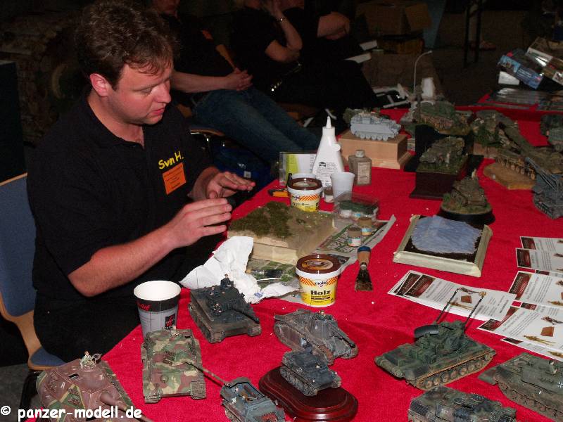 Verteilt über beide Tage gab es neben der Ausstellung auch diverse Vorführungen von RC-Panzern. Wer von dem Krach (oder besser 'originalen' Motorengeräuschen) genug hatte, konnte am Samstag und am Sonntag dem Geländebau-Workshop von Sven beiwohnen, der schnell und eindrucksvoll zeigte, wie man eine Geländeplatte (oder neudeutsch Base) mit Vegetation erstellt. Als Grundlage diente Sven der Bericht 'Natur Pur' von Martin Roth, den man hier in einer ausführlichen Version nachlesen kann. Die schönen Grundplatten wurden uns netterweise vom Sockelshop zur Verfügung gestellt