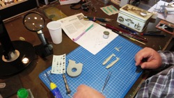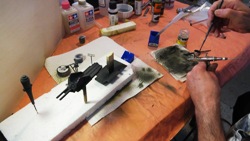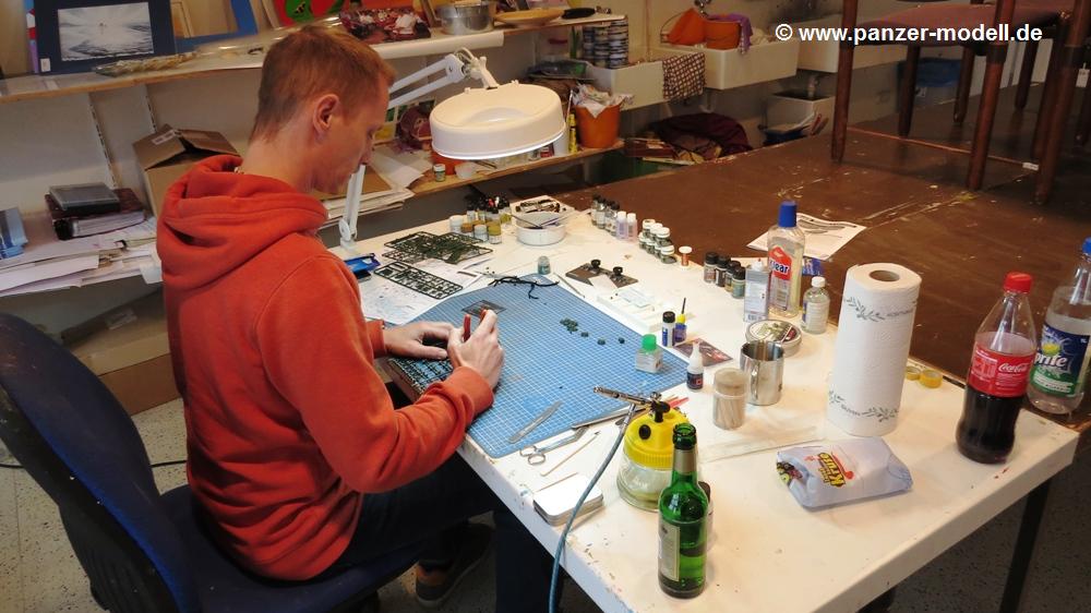 Axel bastelt ein grosses Eisenbahngeschütz im kleinen Maßstab.