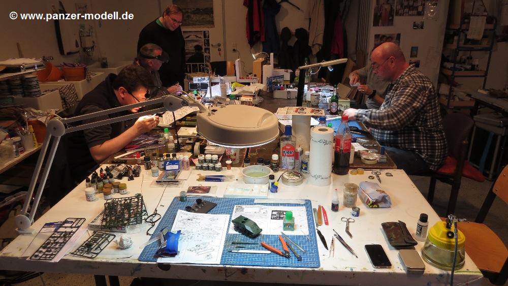 Überblick über das Studio - im Hintergrund der Basteltisch von Holger, Ingmar, Mike, Marina und Christian. Dort war auch die "Lackierstation" untergebracht. Im Vordergrund der Tisch von Axel, Frank, Thomas und Jörg (der im Bild noch fehlt).