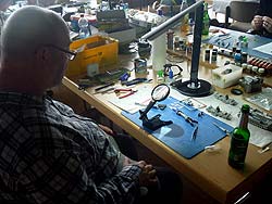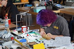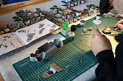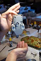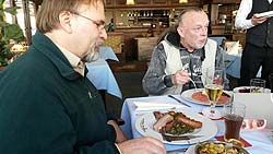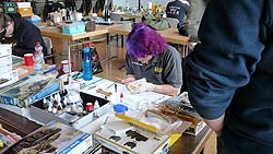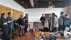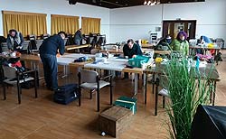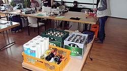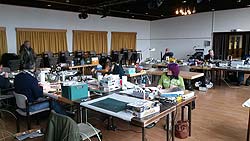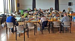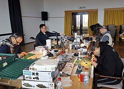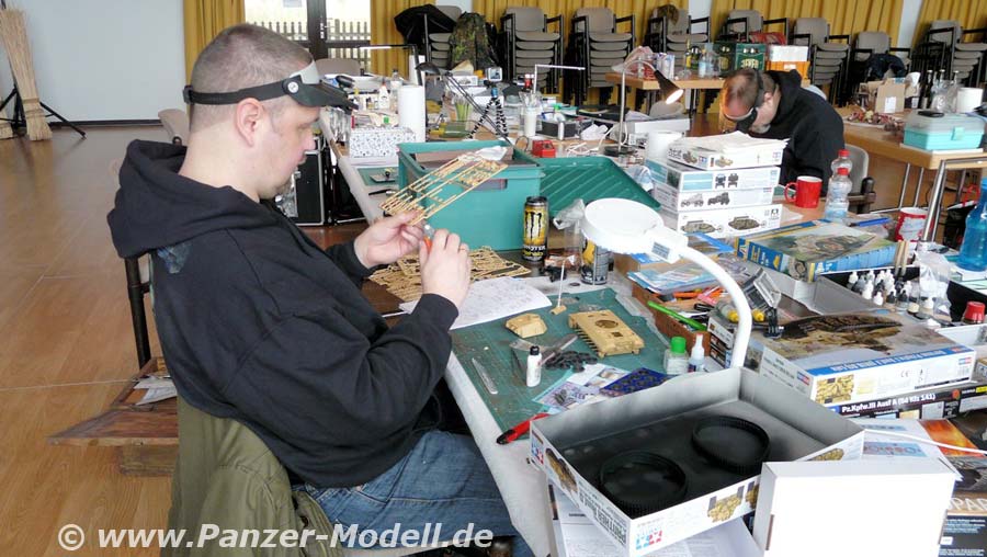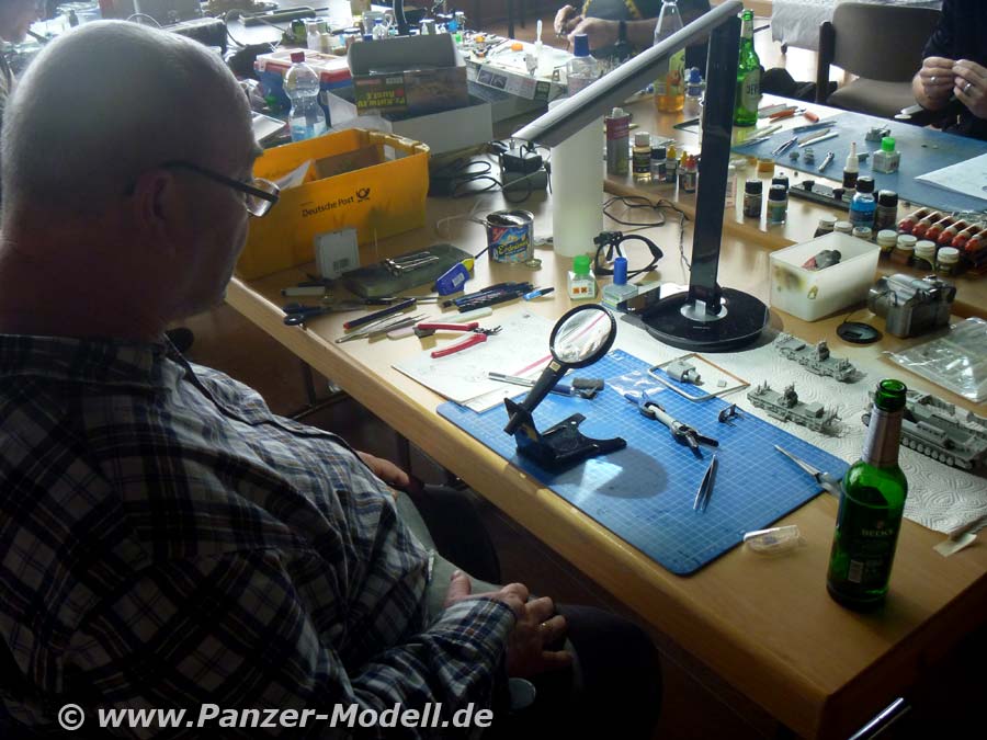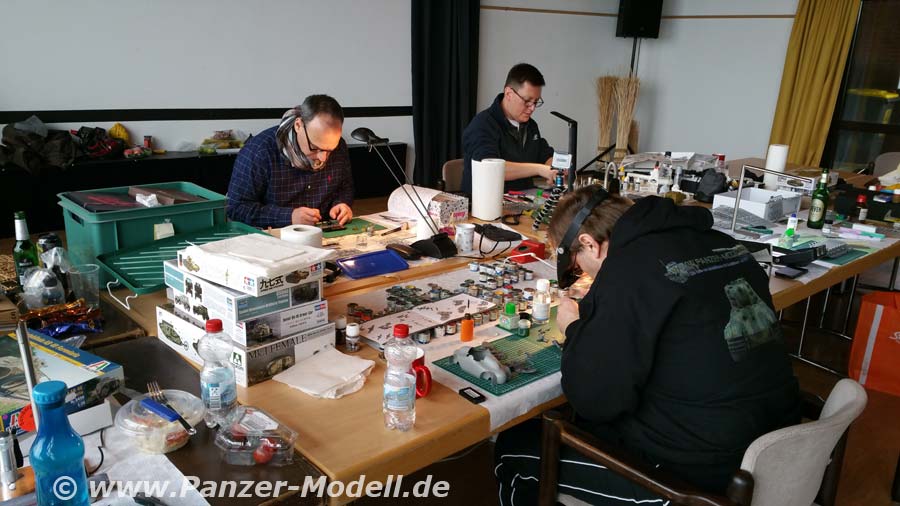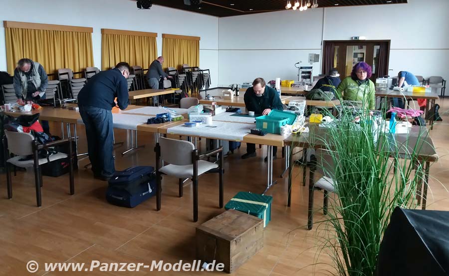 Nach dem Scalemates Meeting ist vor dem Scalemates Meeting! Während wir unsere Vorfreude auf unser Jubiläumstreffen - 5 Jahre Scalemates Meeting - aufbauen, schauen wir noch einmal zurück. Was 2012 mit Thomas Idee begann, von Holger logistisch umgesetzt und zum 1. Scalemates Meeting in der Palette auf Wangerooge im Februar 2013 führte, ist mittlerweile eine feste Institution und wahre Modellbauorgie geworden. Ursprünglich war mal Modellbauen von Montags bis Samstags angesagt, aber bei einem solchen Team reicht das einfach nicht. Nachdem wir uns im Scalemates Chat gegenseitig hochgeschaukelt hatten, reisten die ersten mit der ersten Fähre (08:30 Uhr) Samstags morgens an. Dabei war es egal, wie weit die Anreise war. Freitagabend 20:00 Uhr waren Thomas M. und seine Frau bereits auf der Autobahn gen Norden, gefolgt von den 3 Allgäuern um 23:00 Uhr und den Franken um 23:30 Uhr. Soweit es ging haben wir uns unterwegs getroffen und sind gemeinsam weitergefahren. Ralph stiess dann nach Hannover noch zu uns und auf der Fähre war dann fast das ganze Team zusammen. Am Bahnhof Wangerooge begrüßte uns Holger mit einem großen Transparent. Endlich waren wir wieder zu Hause! Nach der teilweisen recht langen Anfahrt erst einmal ins Hotel und Ausruhen? Weit gefehlt! Nicht mit den Scalematies. Ab in den Kursaal an der Promenade und Tische aufbauen. Kurze Zeit später raschelten die Kartons, sirrten die Seitenschneider und Angussstücke flogen durch die Gegend, untermalt von einem Hauch von Kleberduft. Gerüchte behaupten, wir hätten zwischendrin mal die Koffer ins Hotel gebracht, aber da fehlt mir die Erinnerung. 3 Jahre lang konnten wir die Palette nutzen. Da wir aber zahlenmässig gut zugelegt hatten, reichte der Platz nicht mehr. Holger hat mit dem Kursaal einen sehr guten Ersatz gefunden. Dort hatte jeder seinen eigenen großen Tisch und damit genug Platz zum Basteln, aber modellbauertypisch schrumpfte die Arbeitsfläche stündlich. Durch die großen Fenster fiel viel Tageslicht ein. Abends haben wir uns mit der Deckenbeleuchtung und mitgebrachten Tischleuchten beholfen. Die Stromversorgung für Kompressoren, Lampen und Bohrmaschinen war perfekt. Für das leibliche Wohl hatte Holger mit Getränken vorgesorgt. Drohend war die Batterie Havanna Club aufgefahren, wurde aber im Sturm erobert und gnadenlos niedergemacht. Das direkt neben dem Kursaal liegende Restaurant Friesenjung war einer unserer beliebten Anlaufpunkte, wenn das Magenknurren das Konzert der Seitenschneider übertönt hat. Wohl so beliebt, dass der Wirt uns persönlich bei der Abreise verabschiedet hat. Überstunden bei der Arbeit sind nicht so beliebt, beim Modellbauen Programm. Während wir morgens meist gegen 09:00 Uhr begannen, ging es abends mindestens bis nach 20:00 Uhr, oft auch bis 23:00 Uhr. Manche sind auch erst morgens um 02:30 Uhr aus dem Kursaal rausgekommen und standen trotzdem um 09:00 Uhr wieder auf der Matte. So war der Ausstoß an Modellen auch diesmal wieder recht beträchtlich, wie Ihr auf den Bildern sehen könnt. Unser Tun blieb nicht unbeachtet. Täglich schneiten Besucher rein, um zuzuschauen und Fragen zu stellen. Der NWZ Online waren wir sogar einen kleinen Artikel wert - sinnigerweise in der Rubrik Lokalsport. Soll mal einer sagen, Modellbau wäre keine körperliche Tätigkeit! Auch der Wangerooger Inselbote stattete uns einen Besuch ab, um Fotos zu machen und uns zu interviewen. Aber genug geschwafelt - schaut Euch die Bilder an! Und wem das nicht reicht - das nächste Treffen ist schon in Planung!