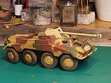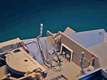 Nun konnten Ober- und Unterwanne miteinander verklebt werden. Dies klappt ohne größere Probleme, die Paßgenauigkeitkeit ist sehr gut. In einem weiteren Schritt werden die seitlichen Staukästen an den Rumpf angebracht. Ich habe hier eine Klappe aufgesägt. Der weitere Bau gibt auch keine großen Rätsel mehr auf. Anstelle der Werkzeuge habe ich nur geätzte Halterungen von Voyager angebracht. Lediglich die Montage des geätzten Pak-Schildes ist ein wenig knifflig. Beim Abschnitt 19 hat sich Dragon allerdings einige Fehler erlaubt. Die Bezeichnung für die Teile E42 und E47 sind seitenverkehrt. Desweiteren muß Teil E43 um 180 Grad gedreht eingebaut werden.