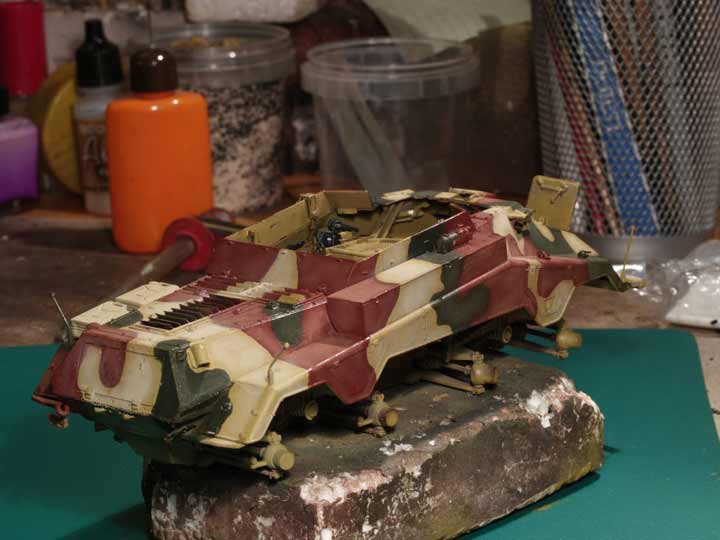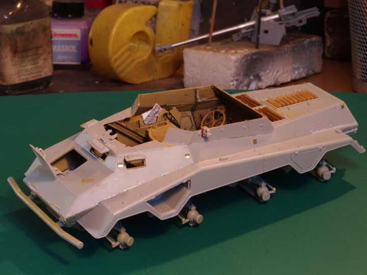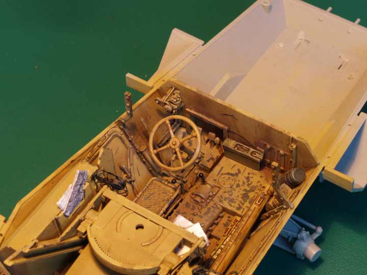 Anschließend wurde der Innenraum mit XF-60 von Tamiya lackiert und einigen Filterings versehen, um ein wenig Tiefe in den Innenraum zu bringen. Abschleßend gab es noch ein Washing mit verdünnter Ölfarbe (van Dyck Braun). Gebrauchsspuren habe ich mit Matt Schwarz von Humbrol und einem dünnen Pinsel aufgetragen. Um dem Innenraum ein wenig Leben einzuhauchen habe ich noch einige Ausrüstungsgegenstände aus der berühmten Grabbelkiste hinzugefügt. Die Fahrerfigur stammt im Übrigen ebenfalls von Dragon. Es ist ein Fahrer für ein Sd.Kfz 251. Damit war der Bau des Innenraums schon abgeschlossen.