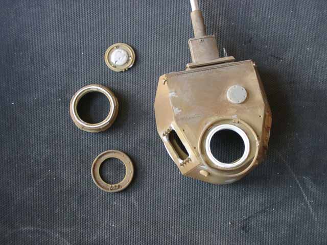 Der Turm ist komplett gestrippt, alle Luken, die Kanone, usw. habe ich entfernt. Die Schweißnähte müssen nachgraviert, bzw. neu erstellt werden. Und ich habe auch zahlreiche Bohrungen auf dem Turmdach ergänzt. Hier sind die Aufhängungen der Luken in der Stirnpanzerung verschraubt. Das MG in der Blende entfällt, die Funkanlage benötigte diesen Platz. Also habe ich die Ummantelung aufgebohrt. Als KwK kam ein Jordi Rubio Teil zum Einsatz. Den Turmring habe ich aus einem Profil von Evergreen neu aufgebaut, um den Abstand zwischen Wannendeck und Turm zu gewährleisten. Die Seitenluken hatte ich noch von Tamiya`s Pz III übrig, sie weisen eine sehr schöne Innendetaillierung auf. Jedoch müssen die Lukenöffnungen in den Ecken abgerundet dargestellt werden, Spachteln ist angesagt! Im Verlauf der Fertigung entfielen in den Luken die Kinonblöcke (Turmschürzen!), wer den Turm in seiner späten Version bauen will, sollte dies beachten! Über den Luken sind selbstgebaute Regenrinnen aus Kupferblech, die Griffe über ihnen sind aus Draht. Der Turmstaukasten und seine Halterungen wurden von mir überarbeitet, ebenso die Heißösen an Turm und Kanone. Zusätzlich spendierte ich dem Turm noch zwei Pistolenstopfen aus der Grabbelkiste. Auch diese entfielen während der Produktion, die Schürzen ließen sie sinnlos werden.