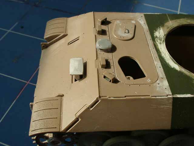 Weiter geht es auf dem Motordeck. Die runden Verschlüsse der Lufteinlässe bekommen andere Griffe verpasst, der Antennensockel hat nur drei, anstatt vier Bolzen, die Kühlwasserverschlüsse sind geringfügig überarbeitet, die Luke zum Motorraum hat Scharniere von Revell`s Jagdpanther, der Lukenanschlag ist scratch, der Lufteinlaß für den damals geplanten Schnorchel ist mit einer runden Platte mittels vier Bolzen verschlossen.