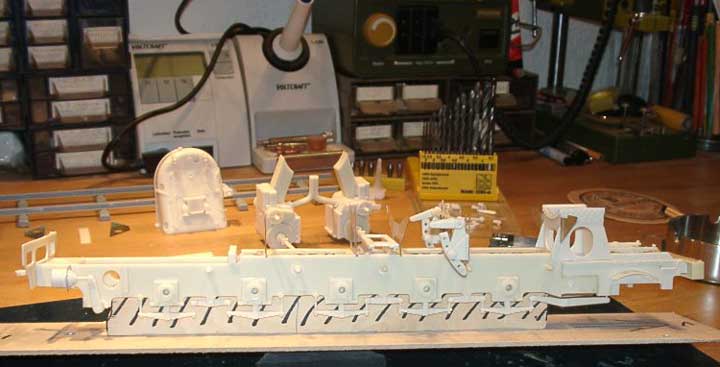 Die Teile des gerade angesagten Abschnitts werden vom Anguß gelöst, geschliffen und gefeilt. In lauwarmen Wasser mit Geschirrspülmittel werden sie von Trennmitteln befreit, klar nachgespült und getrocknet. Dies hat den einfachen Grund, daß nach Fertigstellung der Lok die Bemalung gut haften soll!