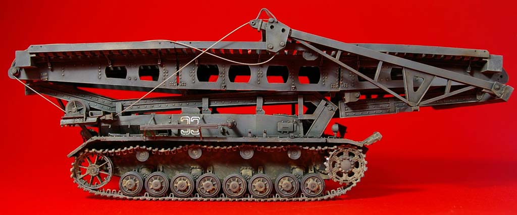 Vorneweg... habe ich mir überlegt, den BL irgendwann einmal auf einen SdAnh. 116 zu verladen; daher der Kettenschaden. Was mich zu der Überlegung brachte: wieviel wiegt den so ein Brückenleger eigentlich? Kettenpapst Thomas L. Jentz spricht von 28 Tonnen Gewicht, die m.E. seriösere Quelle Walter J. Spielberger gibt 28 to. als Brückenbelastbarkeit an. Passt mir persönlich auch besser, bei 22 to. Tragfähigkeit des SdAnh. 116 erscheinen mir sechs Tonnen als Sicherheitsreserve denn doch etwas zu blauäugig.