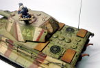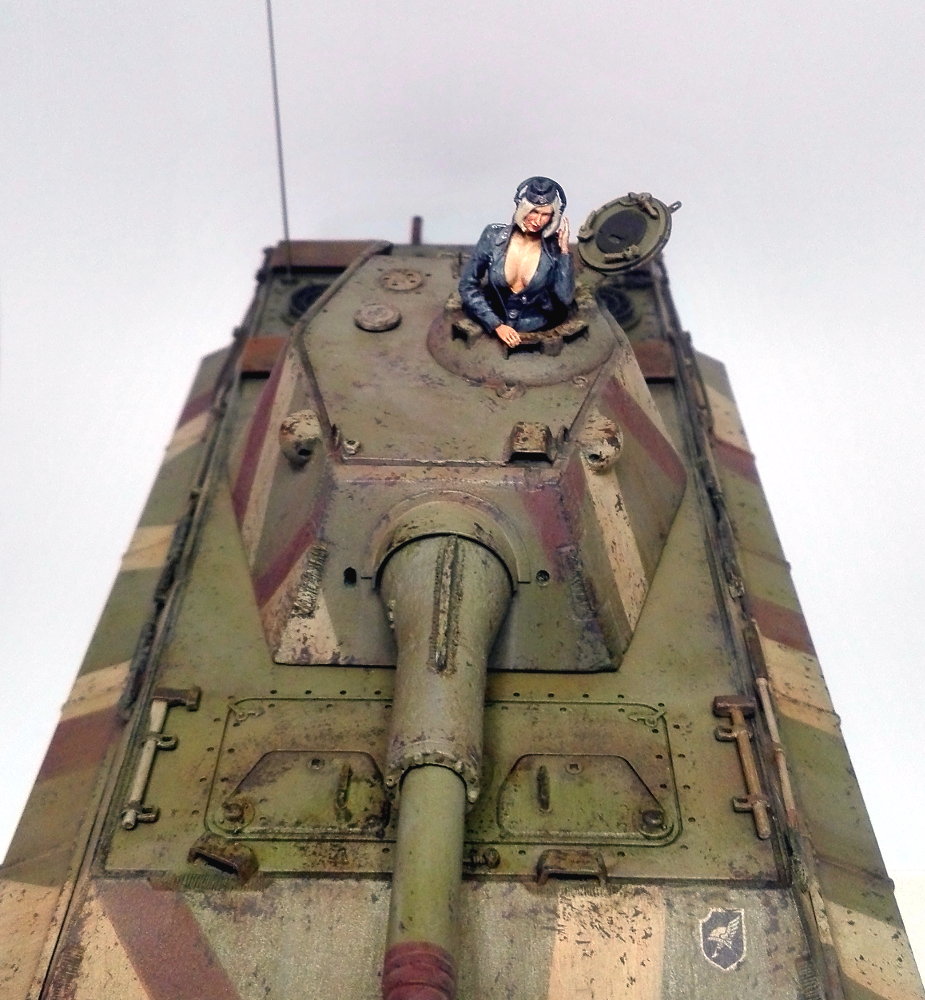 Kommen wir nun zum Ende: Ein feiner Bausatz, gute Passgenauigkeit und sehr ordentliche Details, insgesamt ein Modell dass mir mächtig viel Spaß bereitet hat. Sehr bedauerlich ist nur der kleine Fehler am Laufwerk. Hier hat Trumpeter einen echten Bock geschossen. Auch die etwas grob modellierten Werkzeuge schmälern den guten Gesamteindruck. In Verbindung mit dem schweren Gefechtsturm von Customscale ist aber doch ein kleines Schmuckstück für die Vitrine entstanden. Bei der Kommandantenfigur erlaubte ich mir einen kleinen Eyecatcher und verwendete eine Resinfigur von Armor35. Die Dame lässt tief blicken...