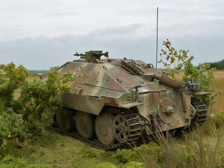 Die Jagdpanzer und Flammpanzer 38 hatten zu der Zeit der mittlerern Produktion ein scharfkantiges Tarnschema. Ich habe mich auf ein Farbprofil aus einem Osprey Heft verlassen und ein Dreifarbschema gewählt, das ich mit der Airbruh aufgetragen habe.