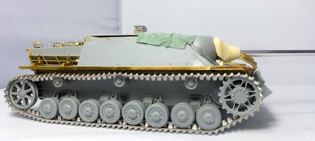 Auf dem Motordeck habe ich alle Werkzeughalterungen sowie die Ersatzkettenhalterung durch Ätzteile ersetzt. Das Deck wird erst später mit der Wanne vereint. An der Oberwanne habe ich weiter nach Anleitung gearbeitet, dabei wird zuerst das Kanonenrohr mit der Rohrwiege verleimt.