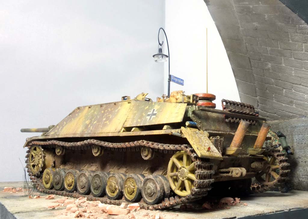 Da mir der Jagdpanzer nach dem Fading zu matt erschien, erhielt er eine Lage Seidenglanzlack. Mit einem Pin Wash habe ich alle Vertiefungen herausgearbeitet. Weiter ging es mit den Effekten für Schmutz und Dreck. Hierbei habe ich Streaks mit AK´s Streaking Grime und Rainmarks mit Dust Effects aufgebracht. Diese beiden Produkte sind dabei sehr hilfreich, da sie schon fertig gemischt sind. Für die Dreckspritzer habe ich Earth Effects und Dark Earth von AK benutzt.