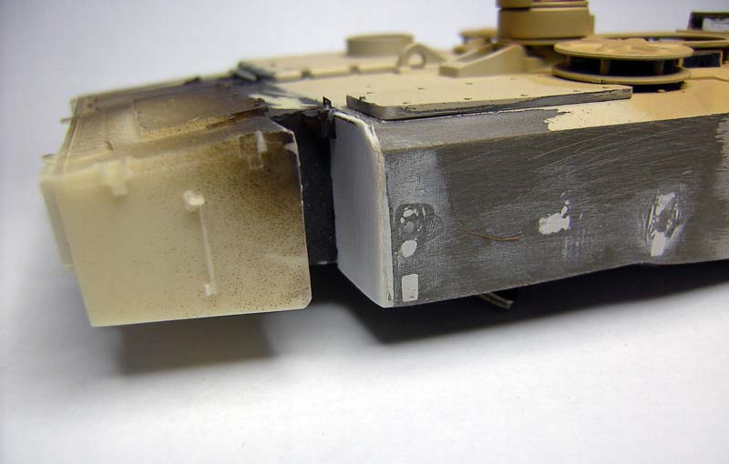 Dazu muss aber zunächst die Tamiya Oberwanne nachgearbeitet werden. Die vorderen Kettenabdeckungen am Wannenbug müssen entfernt und hinten rechts muss in der Oberwanne eine Aussparung für die APU ausgesägt werden. Dazu nahm ich das HB Wannenoberteil als Vorlage. Anschließend wurden die HB Bauteile für die Zusatzpanzerung am Wannenbug, Bauteile K1, K10, K11, K12 und K13 sowie die APU, Bauteile F14 und F15, angepasst und eingesetzt. Das war schon mal nicht so ganz einfach, aber mit Geduld und einer sehr feinen Resinsäge ließen die Sägeschnitte so sauber ausführen dass die HB Bauteile exakt an die Tamiya Wanne passen. Der Winkelspiegel auf dem Tamiya Bug wurde abgeschnitten, die Öffnung mit 0,5mm Plastiksheet verschlossen.