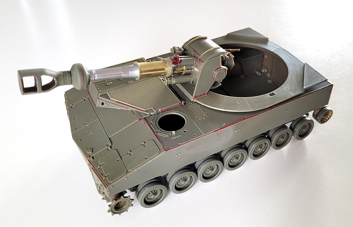 Was man sehen könnte, wäre der Innenteil der 155mm Haubitze, der dem Bausatz beiliegt - allerdings ist der Verschluss nicht der korrekte neue deutsche Verschluss der M109G, wobei nur echte Insider den Unterschied zum vorigen Verschluss der US Haubitze.