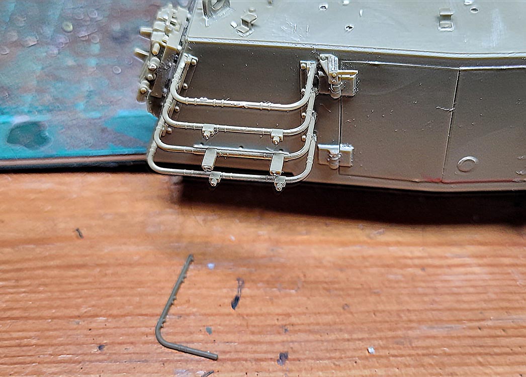 Beim Werkzeug auf dem Turmdach erfreut man sich zunächst über die exzellente Passung der Teile mit den Passnippeln zu den zuvor aufgebohrten Löchern. Ein Wermutstropfen ist, dass AFV Club bei den Teilen AD6 ein Fehler unterlaufen ist, denn beide Teile sollten exakt gleich aussehen mit den U-förmigen Enden in denen die Stangen eingelegt werden - leider ist das nur bei einem Teil so, dem anderen fehlen die U-förmigen Endstücke.