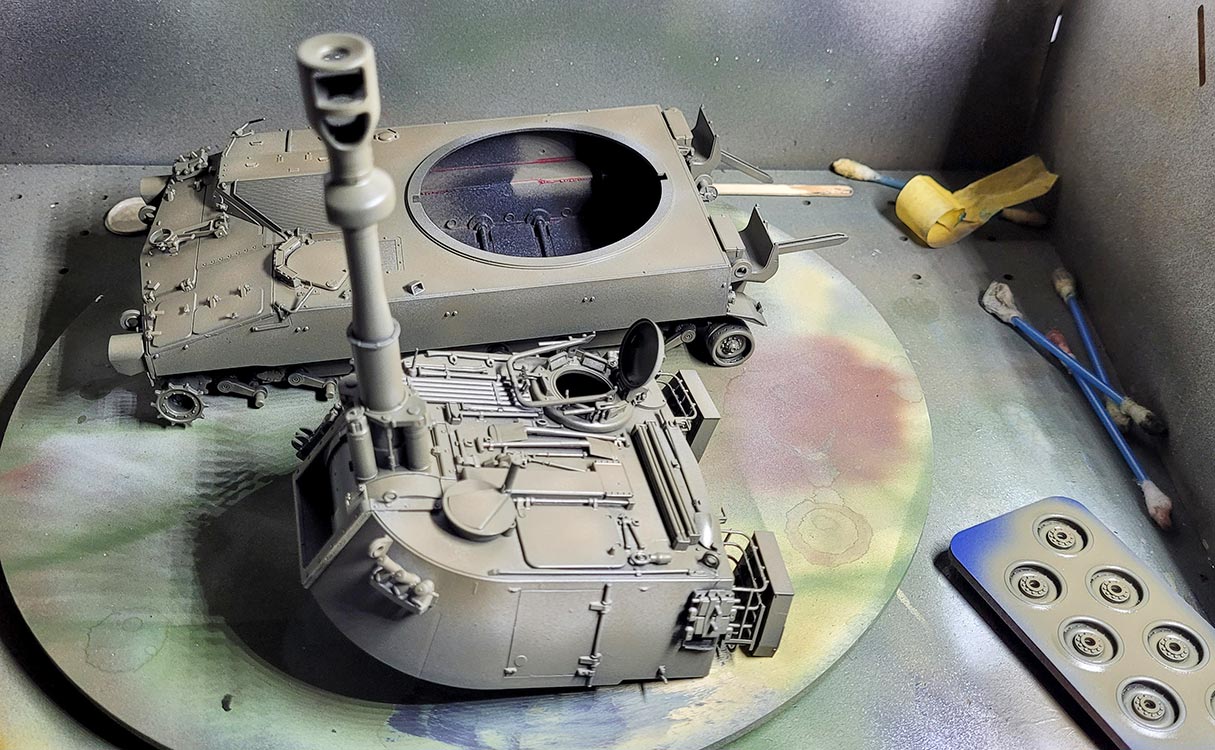 Auf das Filtering habe ich dieses Mal verzichtet, da ich mit dem Farbauftrag des gelboliv bereits sehr zufrieden war und die M109 nun auch nicht so viele abgetrennte Flächen besitzt ,die man farblich voneinander abheben kann.