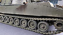 Bei den Treibrädern muss man ein wenig aufpassen, denn AFV Club gibt dies in der Anleitung etwas verwirrend an - es liegen zwei verschiedene Versionen bei, eines für die "frühe" eines für die "späte" Version. Der Clou dabei ist, dass AFV mit der frühen version die meint, die die Bundeswehr initial aus beständen der US Armee erhalten hat und noch die US Ketten nutzen bevor die Fahrzeuge "germanisiert" wurden und die deutsche Diehl Kette eingeführt wurde. Die im Bausatz enthaltenen Vinylketten sind zum einen fein und sauber gespritzt mit scharfen Details und stellen die deutschen Diehl Ketten dar, also die im Bauplan gelabelten "late" Ketten. Ein paar hauchfeine Nähte finden sich auf den Ketten, die aber mit bloßem Auge kaum erkennbar sind.