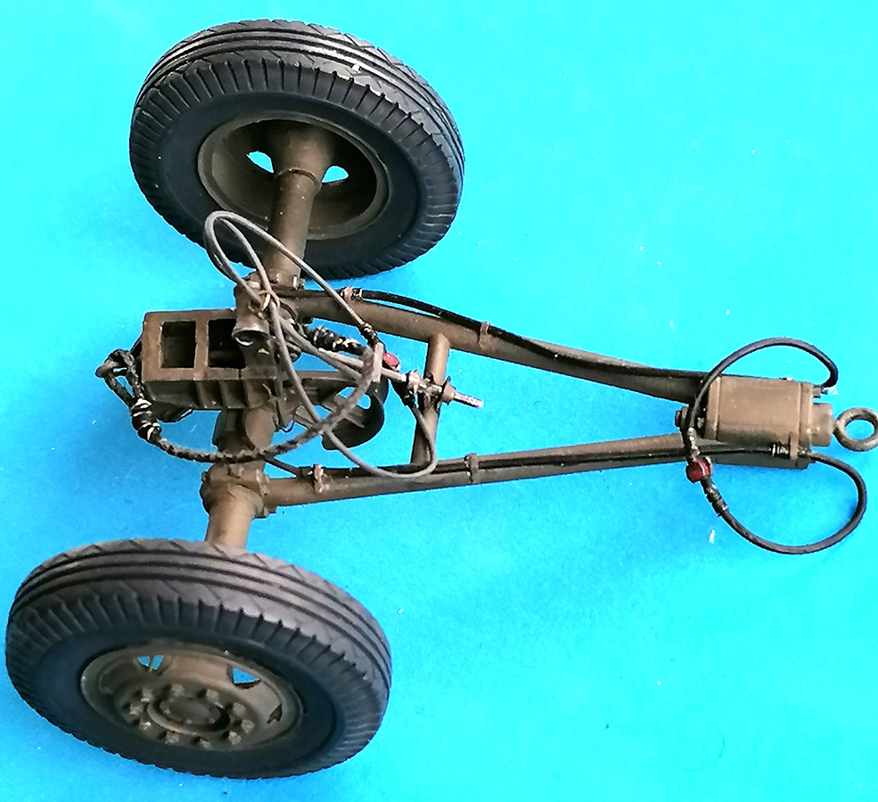 Back to the drawbar. Using the kit's five-hole wheel rims, making it movable is rather easy: Cut through the axle on the outside of the drawbar "clamps", drill through them and into the central part of the axle, then also cut on the other side of the clamps. Insert wire "axle pins" and re-cement the outer axle parts before you mount the kit wheels. With the Masters Productions wheels this was a lot more complicated, but feasible, too.