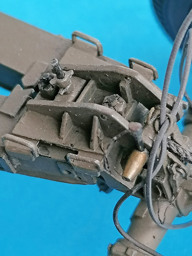 On the trail insides, I cut off the "trapezes" over the air brake couplings which I added from Perfect Scale resin, and re-installed the trapezoid protectors over them. Eduard PE boxes with a set of staffs made from 1mm Evergreen rod replaced the molded-on cleaning staff storage points. The bogie lifting screw wrenches had their stowage bracket imitations sanded off and replaced by contraptions bent from PE runners. Short pieces of stretched sprue were added to the air filters to mount flexible air lines; a "T" from the same material was mounted on the "tunnel" between the gun and the wheels, together with a piece of wire leading into that tunnel and the air reservoir. All flexible lines were made from rubber filament.