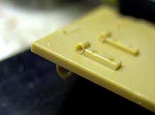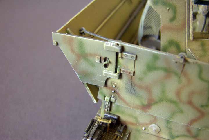 Die Ketten werden erst nach dem Bemalen aufgezogen, wobei ich mir die Friulketten ATL-27 zugelegt habe, da diese besonders gut montierbar sind und einfacher den typischen Kettendurchhang darstellen, als es mit den Vinylketten möglich wäre. Auf der Glacisplatte wurde der Ersatzkettenhalter durch PE Teile dargestellt, und für die Ersatzketten wurden auch Friulketten benutzt.