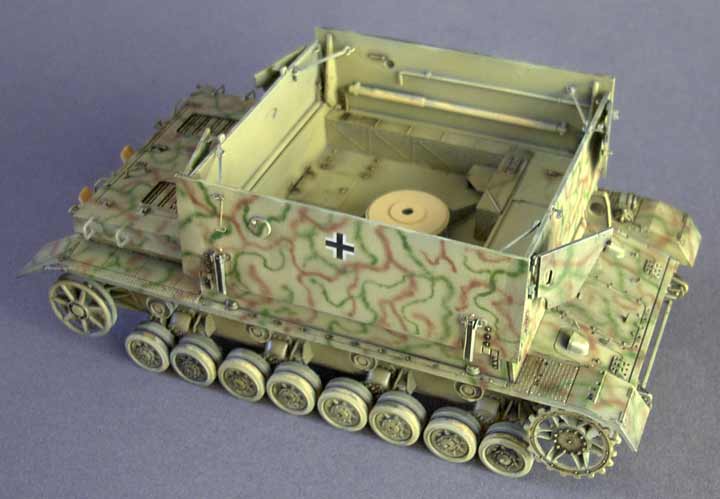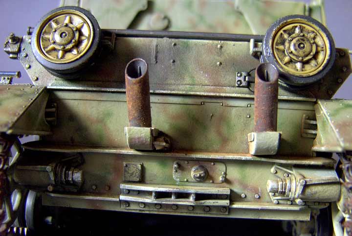 An der Oberwanne werden Luftein- und auslässe und sie hinteren Kettenabdeckungen angebracht. Im Kampfraum habe ich ein paar der Eduard Ätzteile verwendet um z.B. den linksseitigen Luftschacht mit den seitlichen Verstärkungsrippen zu verfeinern. Fahrer und Funkerluke sind offen oder geschlossen darstellbar. Da ich weder Innenraum noch passende Figuren zur Hand hatte, habe ich diese geschlossen dargestellt. Die Oberwanne kann dann weiter mit Kleinkram verfeinert werden, der auch in tarnmuster mitbemalt werden kann. Das ganze Werkzeug, wie immer, am besten erst nach der Bemalung aufbringen. Hinten werden zwei Flammvernichterrohre als Auspuffrohre angeklebt, obwohl diverse Bilder auch den Einsatz eines modifizierten Panzer IV Auspufftopfes zeigen. Der Auspufftopf an sich ist sogar im Bausatz enthalten.