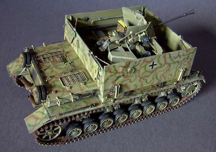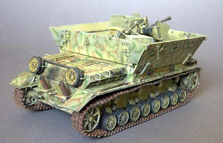 Ein wirklich gut gelungener Bausatz dieses Flakpanzers. Der Zusammenbau macht Spaß und geht sehr leicht von der Hand. Passungenauigkeiten gibt es nahezu nicht. Die Konstruktion der klappbaren Seitenwände ist ein schönes Feature, erfordert aber ein wenig Geschick und ist auch nur begrenzt realistisch wegen der unbeweglichen Stützstreben und Seitenabdeckungen. Diese können, wie gesehen, beweglich gemacht werden, im gewissen Rahmen. Die Flak gefällt sehr gut auch wegen der guten Höhenrichtbarkeit mit Optik. Mit dem Eduard PE Satz lassen sich dann auch noch die letzten Details verfeinern, aber auch aus der Box gebaut ergibt sich ein sehr gutes Modell! Einziges Manko in meinen Augen ist eine fehlende, passende Bedienungsmannschaft für die FlaK.