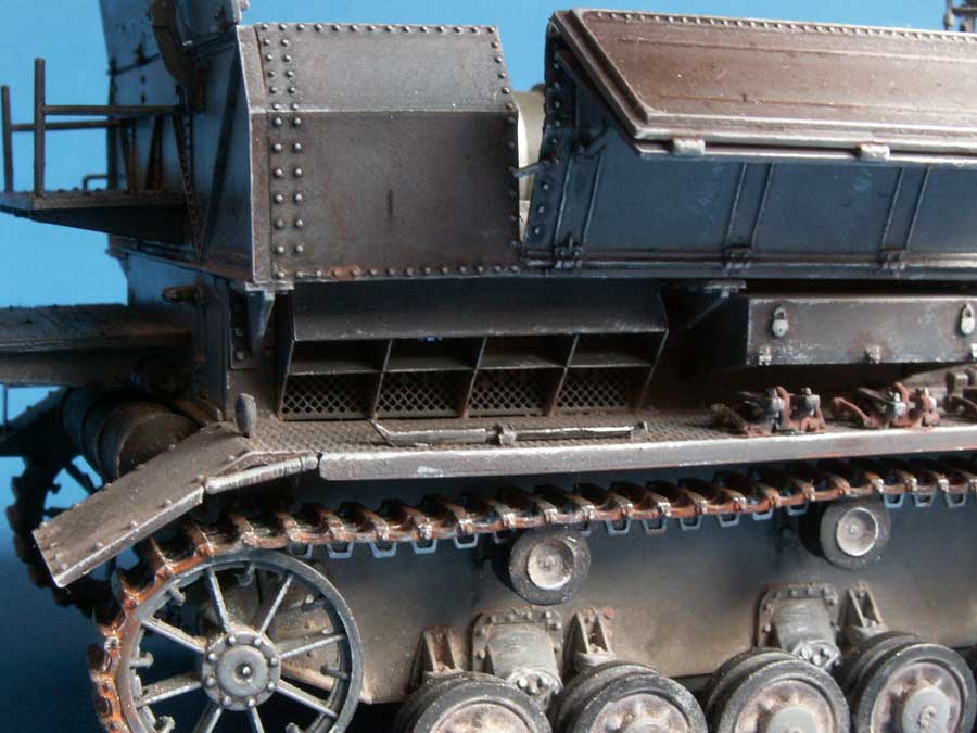 Ein weiteres "Problem" ist, dass aus der Bauanleitung kaum ersichtlich wird, wie denn überhaupt die Seilführung ist. Nach Recherchen hat sich folgendes ergeben. Das Seil für die Höhenrichtung des Arms beginnt auf der rechten Seillauftrommel, läuft oben über das rechte Rad, nach vorn zum rechten Rad. Dort oben rüber nach unten, zurück zur ersten Rollenreihe, dort die mittlere von oben nach unten und wieder nach vorn zur ganz linken Rolle von oben nach unten laufend und zurück zu Teil H46, wo das Seil verklebt wird. Allerdings läuft das Seil an den Seiten bei hohem Ausleger Arm direkt in Kollision mit den Streben des Arms - kann so nicht original sein ... ob der Arm hier zu breit gestaltet ist? Zum Glück fällt es nicht zu stark auf. Wer dem ganzen jetzt nicht so folgen kann ... hier gibt es ein gutes Diagramm dazu: http://geraet040.web.infoseek.co.jp/pzIV-crane2.jpgDas andere Seil für den Haken läuft von der linken Trommel über das linke Rad oben nach vorn zur mittleren Rolle, dort nach unten durch den Haken und zurück nach oben in das Befestigungsloch kurz hinter den Seilrollen. Der Greifer für die Granaten kann entweder aus PE Teilen oder aus Plastik gebaut werden - aus Arbeitsersparnisgründen habe ich mich für die Version aus Plastik entschieden, wobei hier die Greifer an sich noch durch zwei PE Teile verfeinert werden. Allerdings muss man an beiden Greifern (H19 & H20) den Spalt oben, in den H7 eingeführt wird, weiter nach unten durch die Verriegelung vertiefen, sodass H7 tiefer drin sitzen kann.Bevor die Ketten aufgezogen werden, würde ich empfehlen das Modell zu bemalen. Bei den Ketten habe ich mich für die Einzelgliedketten entschieden, die einfach zusammenzubauen sind. Der Kran kann dann nach dem Aufziehen der Ketten angebracht und verklebt werden. Ausserdem kann dann das PE Teil des seitlichen Trittrostes am Kettenblech rechts vorn angebracht werden. Nach der Bemalung werden dann die Granaten auch in Position gelegt, wobei ich es so dargestellt habe, dass bereits zwei Granaten entnommen sind. Damit ist der Bau beendet.