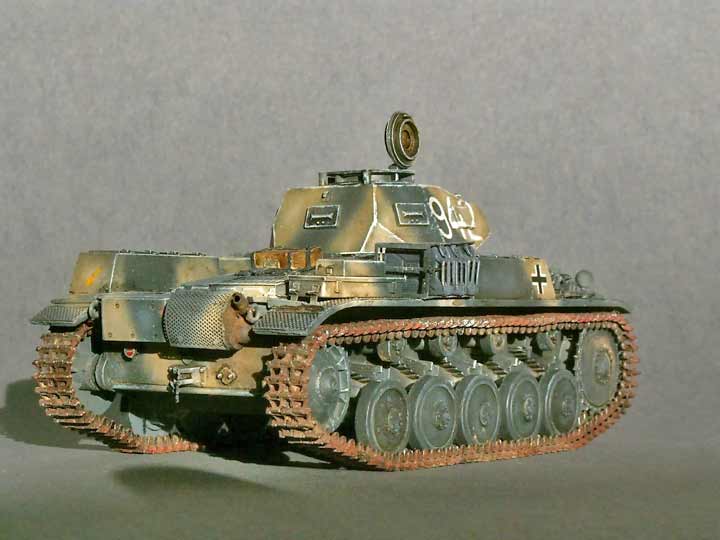Besonderheit der Ausf.a1 war das Leitrad, das aus Silumin gegossen und mit Gummibandage versehen war. Dieses fiel dann bei der Einführung der Ausf.a2 weg und wurde durch ein reines Stahlrad ersetzt. Es folgten dann die Ausführungen a3 und b, gefolgt von der Ausf.c, deren auffälligste Änderung das neue 5-Rollen Blattfeder Laufwerk war, das für die weitere Serienproduktion auserkoren wurde. Dann folgten die Versionen A, B und C, in deren Produktionsverlauf untereinander kleine, interne Änderungen durchgeführt. Nach den beiden Ausführungen D und E, die eine Sonderentwicklung mit 4 Rollen Christie Laufwerk waren und sich nicht durchsetzten, kam die Ausf.F. Diese bekam eine neue und verstärkte Stirnpanzerung und Fahrerfrontplatte, was das Gesamtgewicht auf 9,5t anhob. Desweiteren wurden auch neue Leiträder eingeführt, die im Durchmesser vergrößert waren. Der Panzer II Ausf.F wurde mit 524 Stück produziert, war 4,81m lang, 2,28m breit und 2,15m hoch.