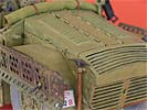 Der Anbringung des Motorabteils stellte sich der Gießharz-Kühler in den Weg, indem er alles nach links schob bis ich merkte, dass seine Positions-Stifte falsch angebracht waren und heftig beschnitten werden mussten. Ein weiteres Foto aus dem genannten Artikel war ebenfalls selbsterklärend die Lüftungsschlitze im Oberteil der Heckwand lassen sich leicht nachgravieren und ebenso leicht auch ganz durchschleifen. Als nächstes rächte sich die Beweglichkeit der seitlichen Klappen denen stand nämlich plötzlich die Oberkante der Kabinen-Rückwand im Weg. Wieder Studium der Vorbildfotos, und siehe da, die Auflage für die Motorhaube bringt das Bausatzteil vorn nicht hoch genug! Wenn man's einmal weiß, ist das ganz leicht mit einem Streifen Plastik zu korrigieren, der das Vorderende der Haube praktisch auf eine Höhe bringt mit der Oberkante der Rückwand. Als Verbindung vom Auspuffkrümmer zum Auspufftopf habe ich ein Stück Spiralfeder genommen, statt die Gussnaht am Bausatzteil entfernen zu wollen.