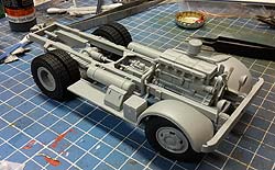 Der Bau dieses Bausatzes beginnt mit dem Bau des Leiterrahmens mit vorderer Stoßstange und dem Motor mit Antriebswelle. Der Anbau ist etwas tricky, da die Teile erst auf der einen Seite eingeklebt werden und erst wenn alle Teile dran sind, der zweite Holm eingeklebt werden kann und dann alle Teile in die richtigen, passenden Aussparungen sollen und dazu vorn in die Stoßstange passen soll. Hier sollte man genau aufpassen alles genau einzukleben und den Rahmen auf Verzug überprüfen, damit am Ende kein Rad in der Luft hängt.