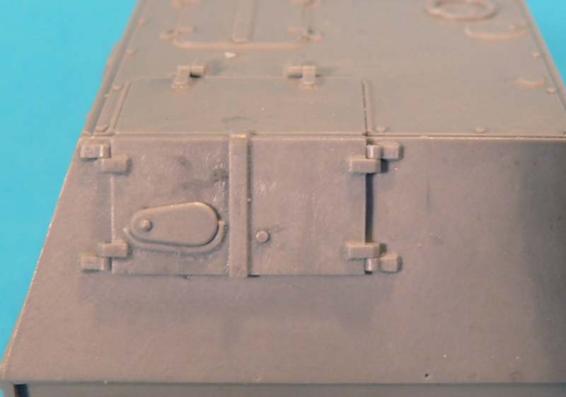 Dann die Werkzeugkisten...boah, wo soll ich anfangen? Die Halterungen und deren Bolzen um sie and den Kettenblechen zu befestigen fehlen gänzlich. Die Scharniere sind so vage ausgebildet dass sie fast unsichtbar sind - und zu allem Überfluss ist der einzige Anguß genau da wo eines davon sein sollte - da hilft nur scratchen (Dicke Alufolie und 0,3mm Rundprofil)