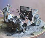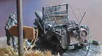 Dieses Diorama stellt in 1:72 eine kleine Szene in Frankreich mit einem ausgebrannten Jeep dar. Noch ein paar Anmerkungen zum Jeep: Es ist das Academy-Modell in 1:72.