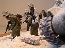 Dieses Diorama zeigt eine Szene im kalten Winter 1944 in den Wäldern nahe Bastogne. Eine kleine Gruppe Deutscher Sturminfanterie Männer entdeckt einen liegengebliebenen Sherman. Wie lang der da wohl schon ist? Tage? Wochen? Frische Spuren im Schnee verraten aber, dass zumindest einige der Besatzung überlebt haben und sich womöglich in den Wäldern verstecken. Die Suche beginnt ... Sowohl der US Sherman M4A3 als auch die Infanterie sind beide von Tamiya. Der Baum ist selbstgemacht, das Haus ist ein Fertighaus. Der Schnee wurde mit Schneespray gemacht.