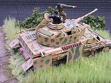 Geschichte August 1944: Nach dem Desaster von Falaise zieht sich die deutsche Wehrmacht aus Frankreich zurück so schnell sie kann. An allen Fronten bröckelt es. Unser Panzer IV Ausführung J hat die heftigen Kämpfe von über zwei Monaten und die Hölle von Falaise wie durch ein Wunder überlebt. Als einer von nur ganz wenigen, wie angemerkt werden muss, denn von den fast 2500 deutschen Panzern, die nach und nach an der Invasionsfront eingesetzt wurden, sind zu diesem Zeitpunkt kaum mehr als 120 übrig geblieben. Man sieht dem Panzer und der Besatzung an, was sie durchgemacht haben. Die nervliche Anspannung hat sich in die Gesichter der Soldaten gezeichnet. Spätestens beim Blick auf die vielen Orden wird jedoch deutlich, daß sie nicht nur Glück hatten sondern auch ihr Handwerk verstehen. So stehen sie nun auf Nachhutposten und müssen zusehen wie die alliierten Truppen unaufhaltsam nach Westen vorrücken. Erst an der deutschen Grenze wird dieser Vormarsch vorerst zum Halten kommen. Mit der Abwehrstärke der Wehrmacht hat dies aber nicht mehr allzu viel zu tun... Modell Der Panzer ist der Panzer IV J von Tamiya. Die übriggebliebenen Schürzen sind Eigenbau, das Gerödel auf dem Panzer ist ebenfalls Tamiya. Ich habe den Panzer nach einer Weile im Regal neu (Airbrush-)lackiert, deshalb sind auch ein paar Fehler am Modell. Der Richtschütze (der aus der falschen Luke geklettert ist ;-)) stammt unverändert aus dem Dragon-Set Nr. 6014. Der Tamiya-Kommandant hat aus diesem Set auch seine Interkomm-Ausrüstung, ist ansonsten aber auch unverändert. Die Grundplatte ist aus Sperrholz und hat einen Moltofill-Überzug bekommen. Das hohe Gras ist früher mal ein Pinsel aus der 1-Euro-Ecke des Baumarktes gewesen. Das Gebüsch ist Meerschaum mit einer Berieselung aus Oregano (?). Weiß nicht mehr, welches Gewürz es genau war J. Das Werkzeug habe ich nach der Methode aus dem Bemalungs-Guide von Panzer-Modell.de bemalt. Ich war seeeehr angetan vom Ergebnis! An dieser Stelle deshalb: Danke für die Hilfe, weiter so!