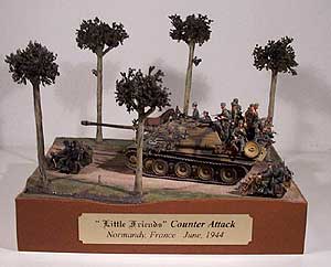Dieses Diorama zeigt eine kleine Szene eines Gegenangriffs in der Normandie im Juni 1944 ... Ein Jagdpanther hat ein paar Soldaten aufgenommen und rollt der Front entgegen.