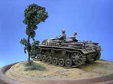Inspiriert wurde ich vom Deckelbild des Infanterie-Figurensatzes und dem Deckelbild des Pz 38 (t) G von Maquette. Eine Geschichte zum Diorama kann sich der Betrachter selber ausdenken. Verwendet wurden folgende Bausätze/Materialien StuG III B - Italeri(Dragon) Dieses Modell ist ein Recycling-Modell , dass es sich um ein schon gebautes Modell handelt, welches wieder zerlegt und neu zusammengesetzt wurde. Ergänzt wurden geätzte Gitter für die Lüftungsschächte. Fotoätzteilreste für die Verschlussmechanismen der Luken. Verdrillter und plattgedrückter Draht für die Kettchen am Rauchgerät, sowie Kettchen aus dem Schiffsmodellbau, die ich in jedoch nicht mehr verwenden würde, weil Ketten an deutschen Fahrzeugen eher unüblich waren. Lackiert wurde das Modell in Panzergrau und es wurden einige braune Tarnflecken hinzugefügt, die jedoch nach den üblichen Prozeduren unsichtbar wurden. StuG-Besatzung Dragon mit Warriors-Köpfen Infantrie Dragon Operation Barbarossa Das Bäumchen ist ein Zweig mit einer Islandmoos-Krone , sowie etwas Basilikum als Blattwerk. Das Gelände besteht aus Molto-Reperaturspachtel (1-Liter-Paltsikbecher). Dieser Spachtel ist von körniger Struktur und lässt sich recht gut bearbeiten. Katzenstreukörner dienen als Steine und Statikgras, sowie Pinselborsten, stellen den kaum vorhandenen Bodenbewuchs dar. Als Basis dient ein ausgedienter Steakteller.