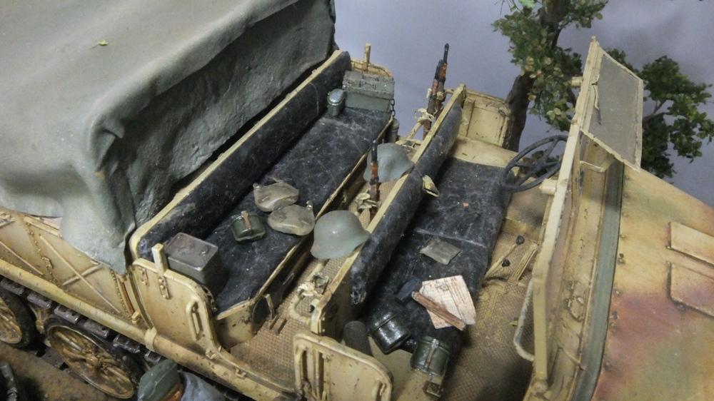 Das Modell: Für die Szene habe ich den Famo von Tamiya (Tamiya 35239) verwendet, der sich in bekannter Qualität bauen ließ. Desweiteren habe ich das Fahrzeug mit einem PE Satz von Eduard, Voyager Peilstangen, AK Scheinwerfergläser und Ketten aus dem Trumpeter-Set aufgewertet. Die Ladung ist von diversen Herstellern und aus der Grabbelkiste. Die Abdeckplane ist aus Green Stuff gefertigt. Figuren von Tristar und Tamiya sowie Miniart ergänzen die Szene. Lackiert wurde alles mit Farben von Vallejo. Die Grundplatte wurde aus Styrodur heraus gefräst und auf einen Holzsockel geleimt. Nach dem Bemalen habe ich Nature in a Pod aufgebracht und ein paar Steinchen aufgeklebt. Auch getrocknetes und zerkleinertes Laub kam hinzu. Der Baum aus Draht ist mit Laub von Mininatur beflockt worden. Kleine Pflanzen von Noch, Gras von J´s Work und Pilze von Maim ergänzen die Szene. Bedanken möchte ich mich bei Herrn Gerth aus Ahorn bei Coburg für die Anfertigung der Grundplatte.