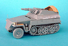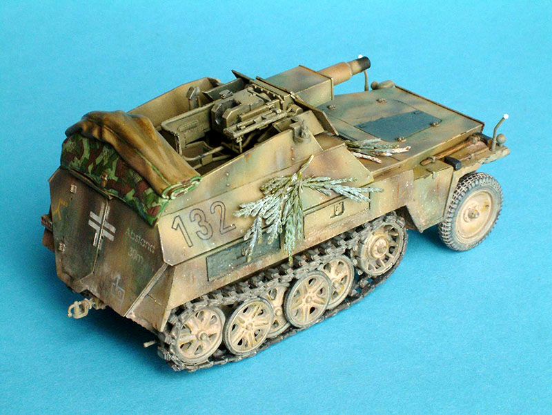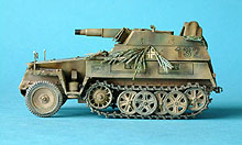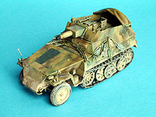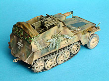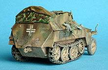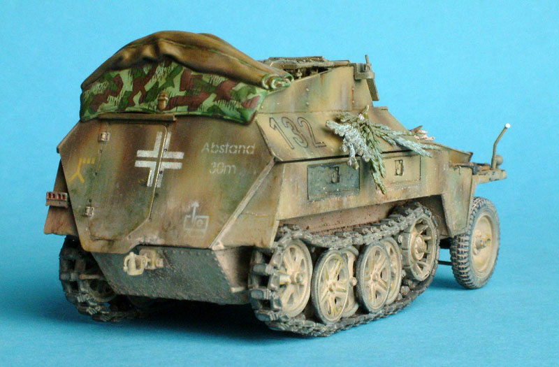 Erbauer: Tobias Fuß Dragon Nr. 6102, Sd.Kfz. 250/8 NEU 7,5cm KwK37(L24) "Stummel" , 1/35 Das Modell ist größtenteils aus der Schachtel gebaut. Geringfügige Verbesserungen wurden hauptsächlich im Innenraum durchgeführt. Außen: Drahtschere von Tamiya, Tarnscheinwerfer von MIG, Regenrinne über der Heckluke aus Evergreen U-Profil, Ösen für das Tarnmaterial von ABER, neue Nietreihen am Aufbau aus gezogenem Gußast. Die Wetterschutzplane als Feldmodifikation stammt von einem anderen Dragon Halbketten-fahrzeug. Der Spriegel entstand aus Evergreen Flachband. Die Bemalung erfolgte mit Acrylfarben, die Alterung mit Ölfarben und Pigmenten.