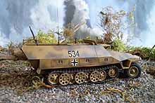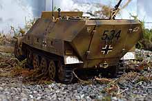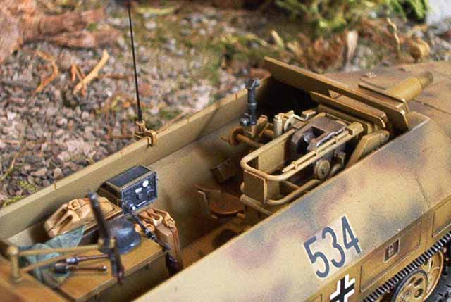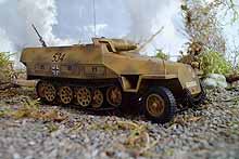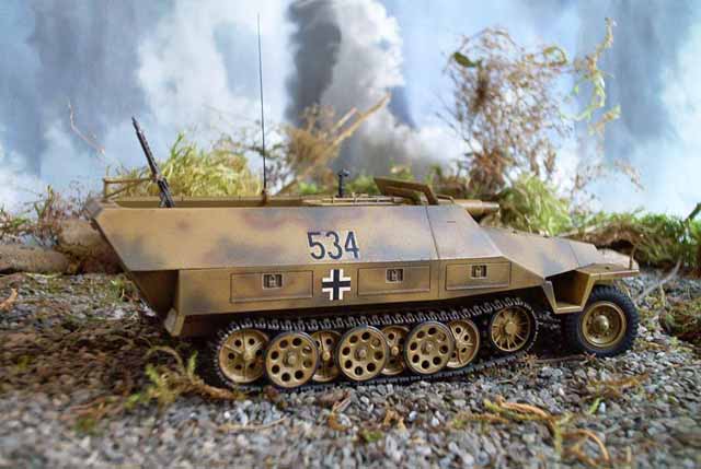 Unser Leser Martin Stiera zeigt uns hier ein weiteres seiner Modelle. Es handelt sich um ein Sd.Kfz.251/9 der Firma Tamiya, das ich mit Teilen aus meiner Grabbelkiste bestückt habe. Wunderschöner passgenauer Bausatz, in normaler Airbrush Bemalung und abschließenden Öl-Finish. Nur bei den Decals habe ich noch meine Anfänger Fehler gemacht, die man nach dem Trocknen zu sehen bekam. Trotzdem ein schönes Fahrzeug geworden wie ich finde. |