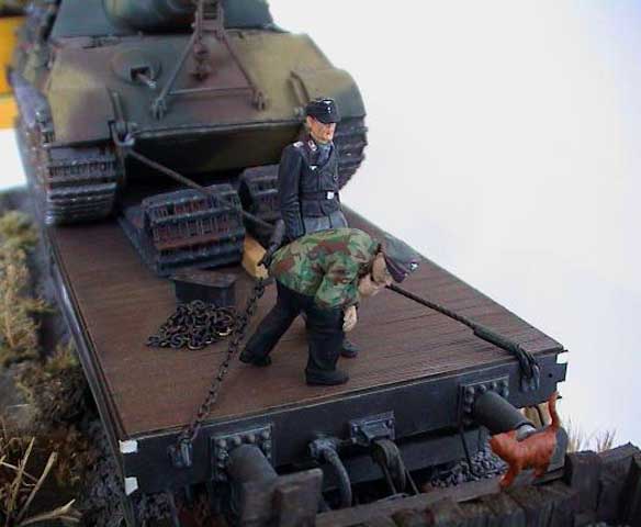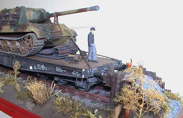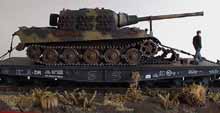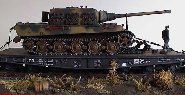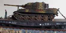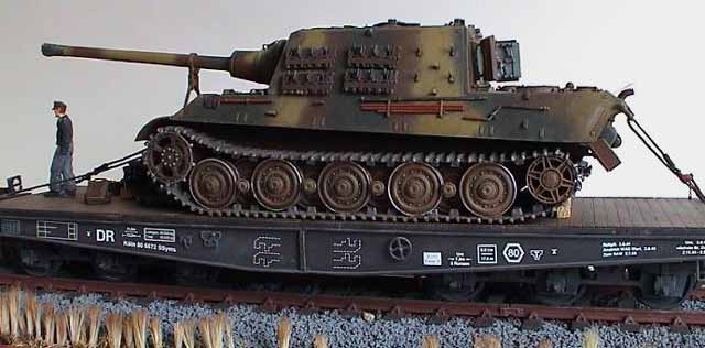 Ein wunderschönes Modell eines Jagdtigers mit Henschel-Laufwerk auf einem Schwerlastwaggon SSyms der Deutschen Reichsbahn von Christoph Garski.
