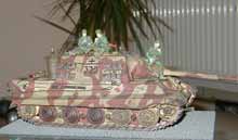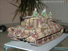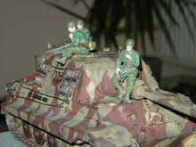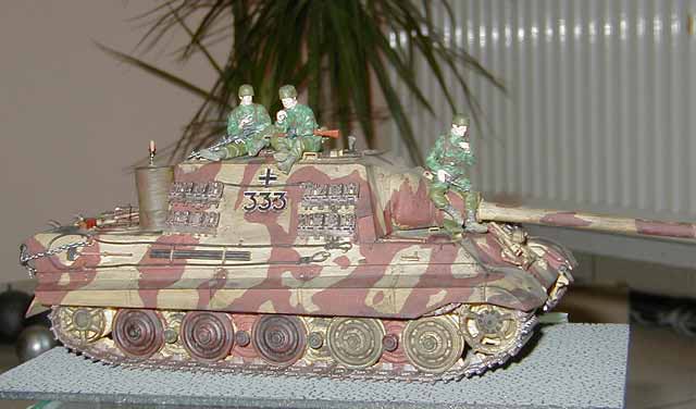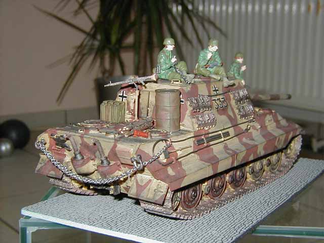 Das Modell eines Jagdtigers von Peter Reuter. Es ist der Revellbausatz direkt ohne Zusatzteile gebaut. Ergänzt wurde nur das Faß ,die Kanister und das Holzbündel. Das ist aus kleinen Stöckchen mit Bindfaden zusammengebunden. Eine Kette aus dem Schiffmodellbau hängt auch noch dran. Die drei Soldaten sind aus dem Dragon-Bausatz "3rd Fallschirmjägerdivision"