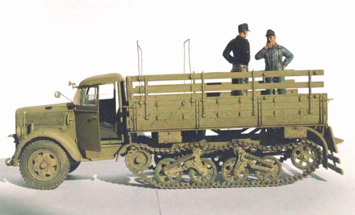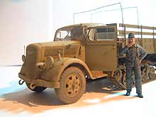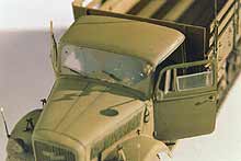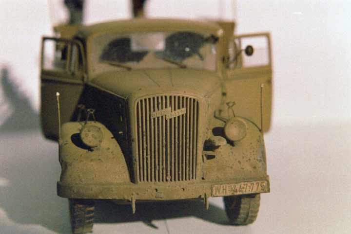 Zunächst wurden sämtlich Lüftungsgitter der Motorhaube aufgefräst und alle Halteösen der Pritsche entfernt. Diese wurden aus Draht neu angefertigt. Die Halterungen für die Scheinwerfer und für die Peilstangen wurden ebenfalls neu gefertigt. Alle Werkzeughalterungen sind aus dickerer Alufolie gefertigt, der Innenraum erhielt Riffelblech (selbstgemacht aus Alufolie), eine Pedalerie aus Draht und Messingblech, Fensterkurbeln und Türgriffe und öffner aus Draht. Die äußeren Türgriffe mussten ebenfalls Eigenbauten aus Alufolie und Draht weichen. Und weil noch eine neue Wischanlage aus (Na, was wohl ?) Alufolie und Draht eingebaut wurde, musste auch die Verglasung neu angefertigt werden. Hierbei wurde gleich die Tür auf "Seitenscheibe mit Dreiecks-Ausstellfenster" umgebaut. Die Scheinwerfer wurden mit Gießharz "verglast" und entsprechend verdrahtet (auch der Suchscheinwerfer). Weitere Kleinteile wurden noch aus den o.g. Werkstoffen ergänzt. Das einzige käufliche Zurüstteil an diesem Modell ist eine MODELLKASTEN-Kette, der Rest entstand alles im Eigenbau. Lackiert wurde mit Tamiya XF60, anschließend Washing mit schwarz-brauner Farbbrühe, Drybrusghing mit Humbrol Sandgelb. Alterung mit Ölfarben, Pastellkreiden, Farbpulvern und Graphitstift sowie einem Gemisch aus fein gesiebter, echter Erde mit Weißleim und Wasser.